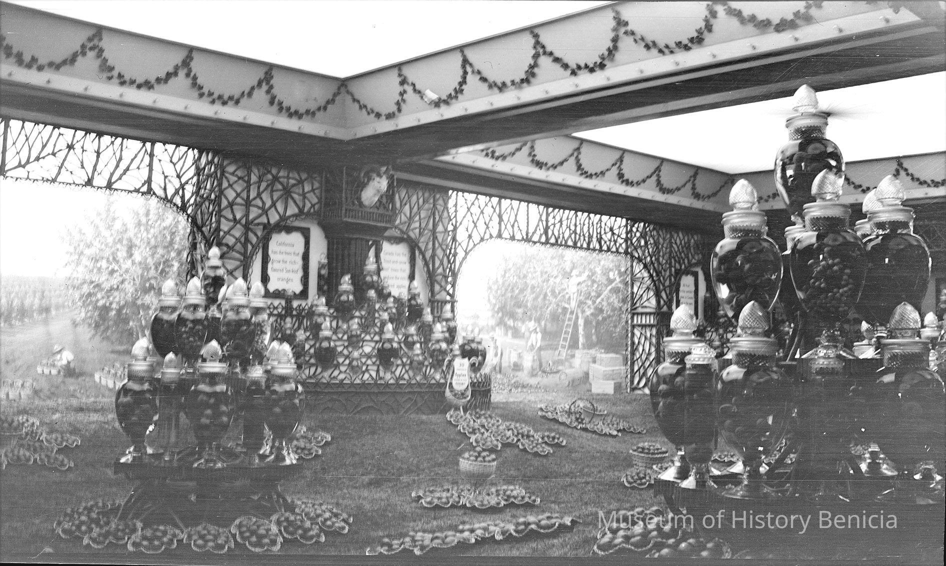 Negative of a hall with jars of fruit and a mural of an orchard in the background. This is the California state hall at the Panama Pacific International Exhibition of 1915 in San Francisco.Collection