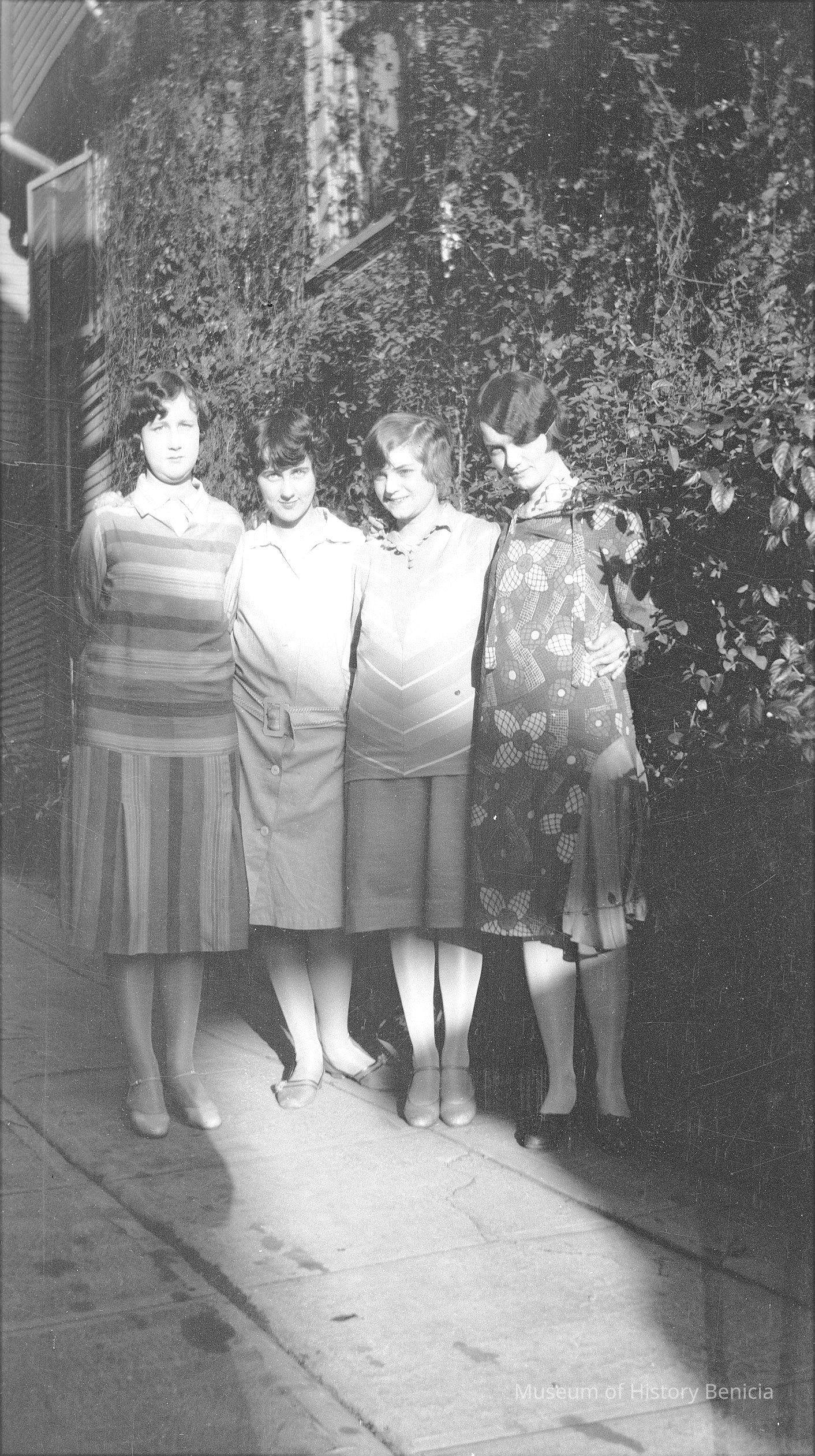 Negative of four women on the sidewalk