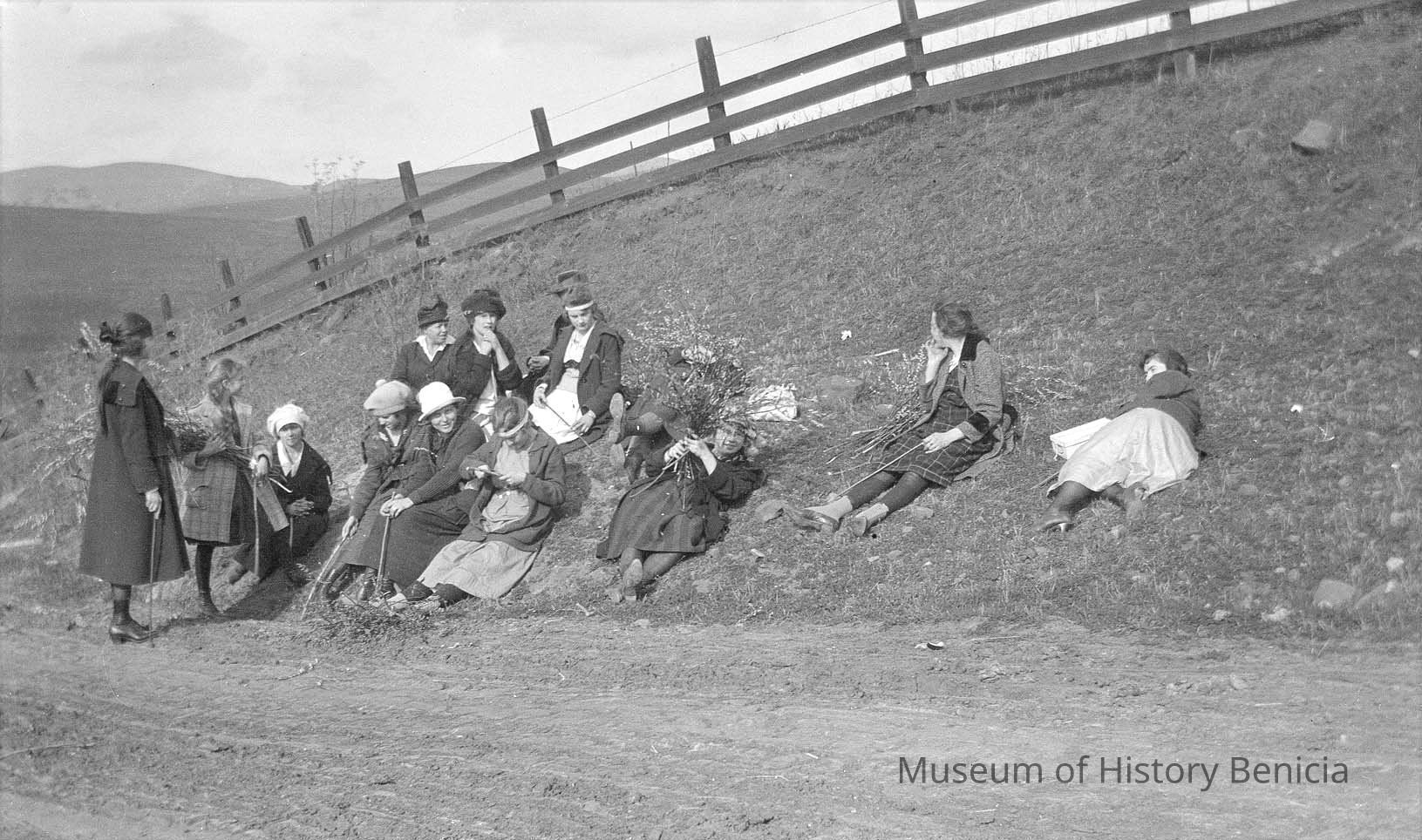 Negative of people sitting on grassy hillside. The envelope says "Hike to Waterwork Feb 2, 1919.