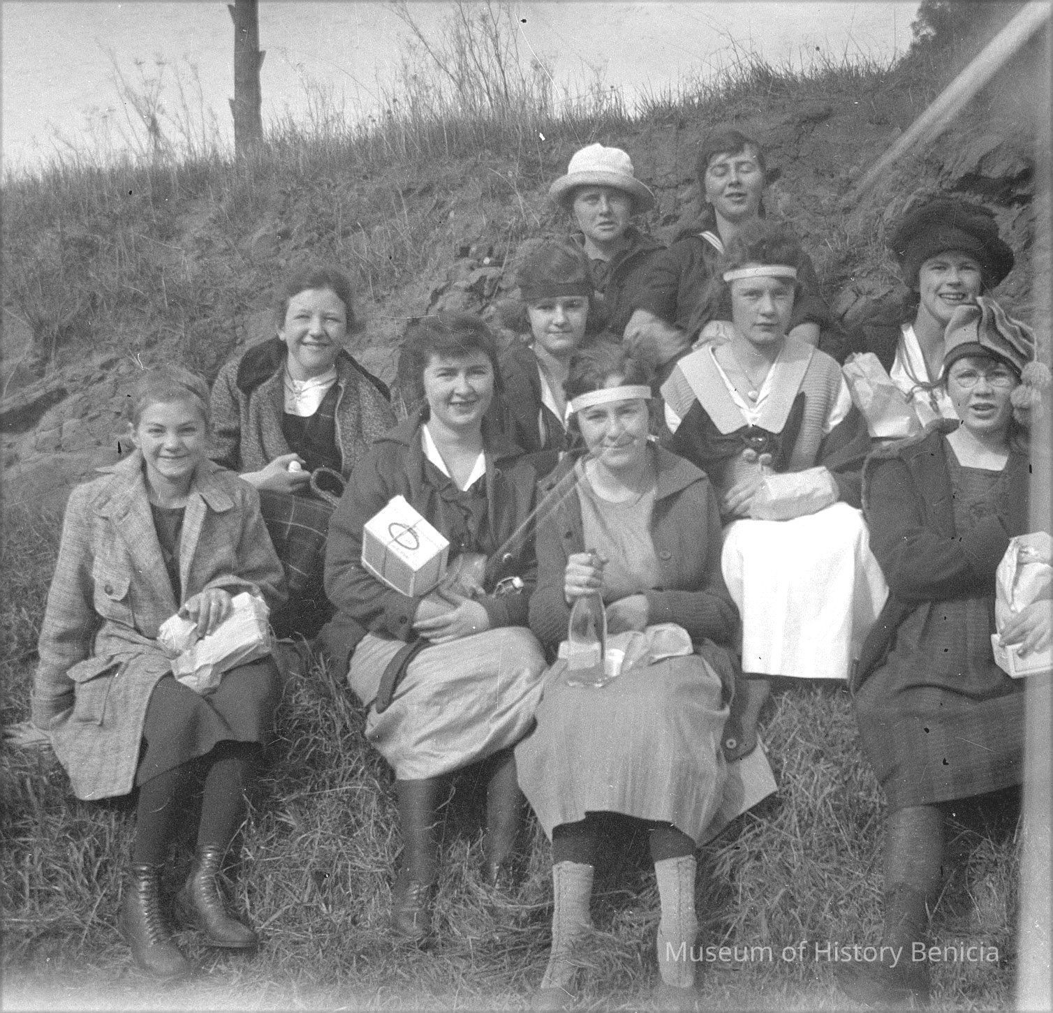 Negative of women by the side of road. Girl on left is Violet Molfino. The envelope says "Hike to Waterwork Feb 2, 1919.