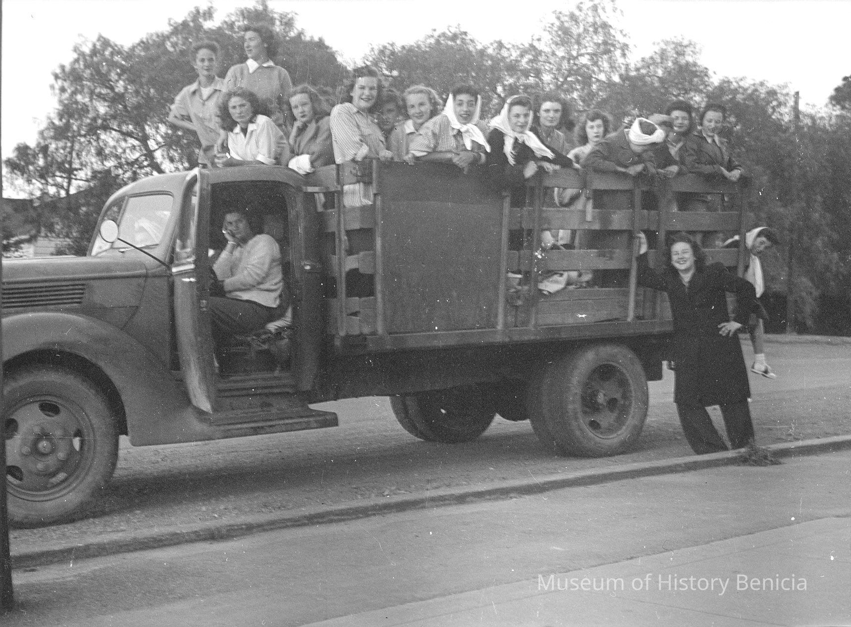 Negative of women in a flat bed truck. The envelope says "One each Molfino"