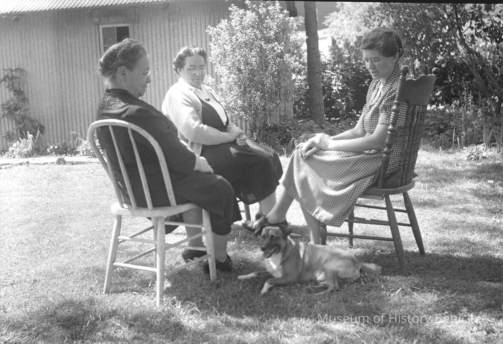 Negative of a three people sitting in chairs in the yard. The woman on the left is Dita Molfino.