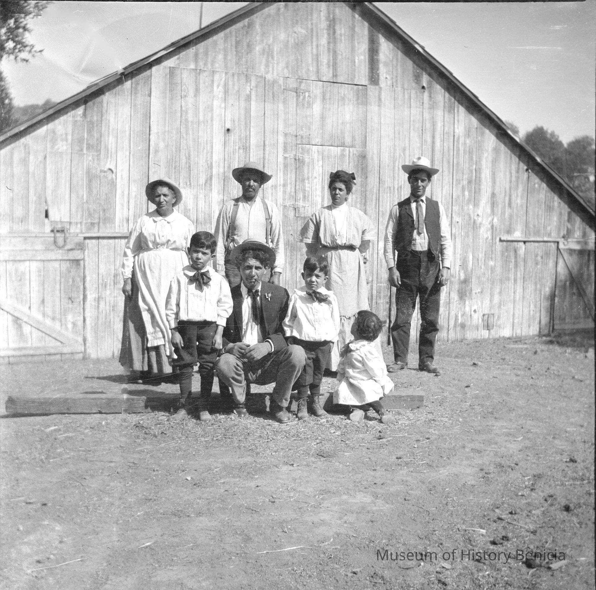 Negative of a family next to a barn. . In an envelope with "of Molfino" scratched out and "Manez" written on the front.