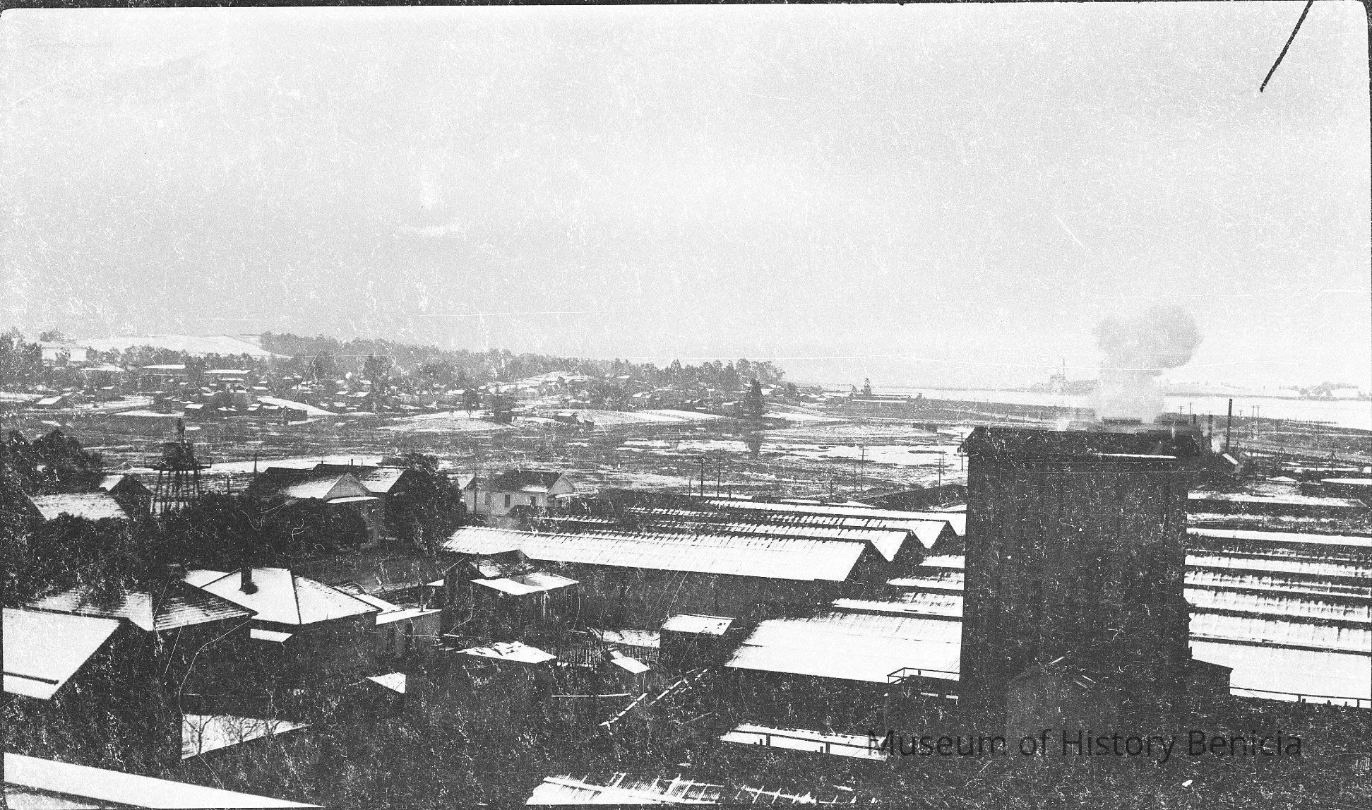 B/W negative. This is a smaller negative than the ones of the Solano Ferry Boat. The scene is of Benicia with snow on the ground.Collection