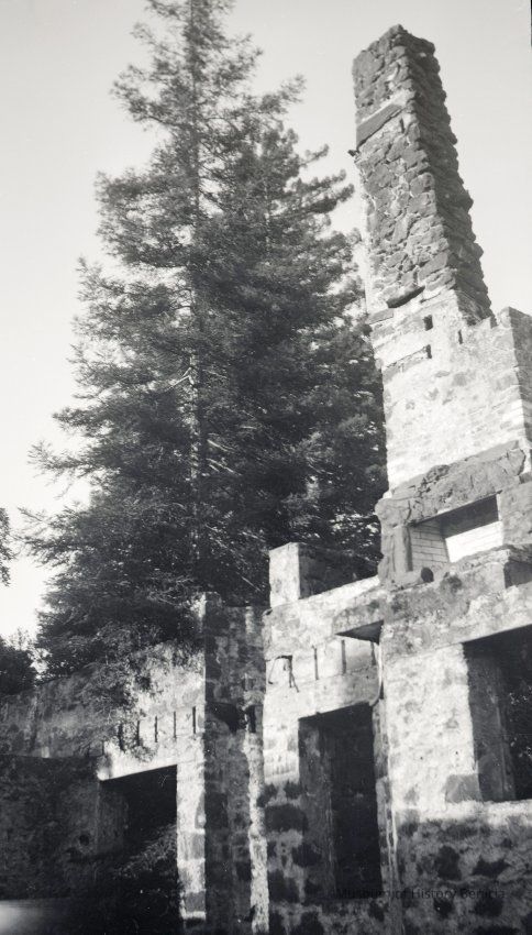 B/W Negative: Jack London's "Wolf House" at Glen Ellen built 1913-14, burned 1915, now a state park. Includes some trees and part of a chimney.