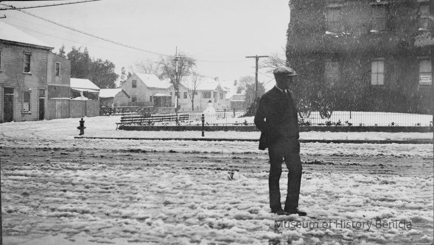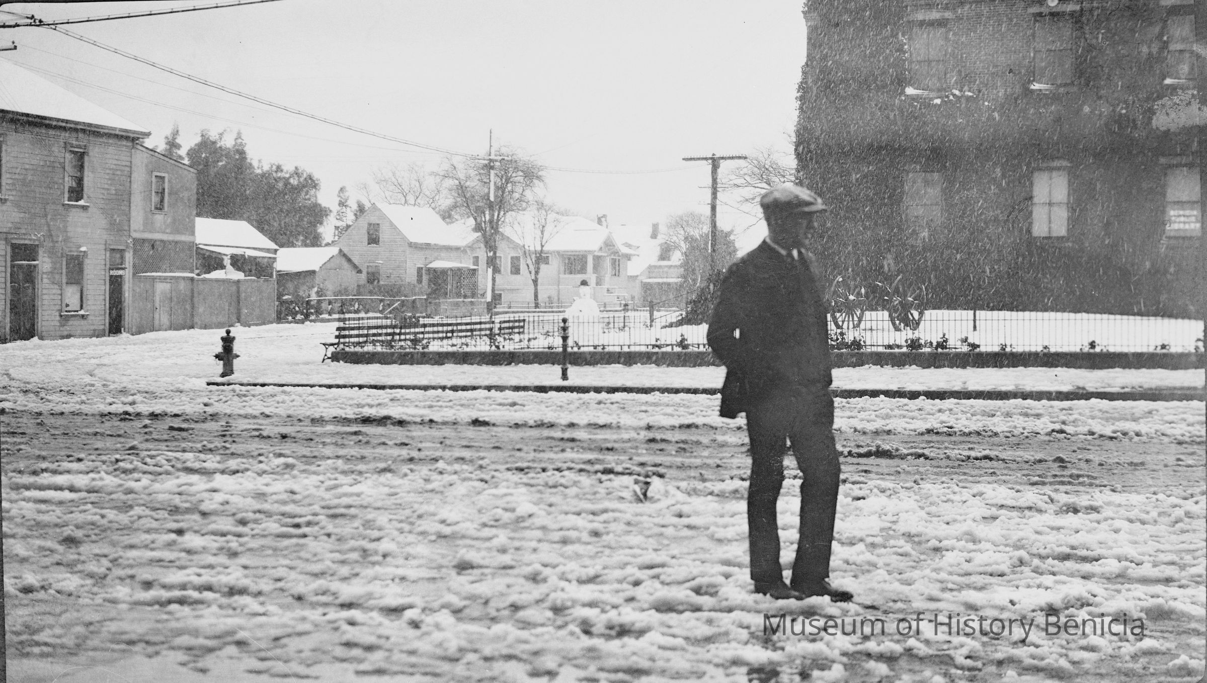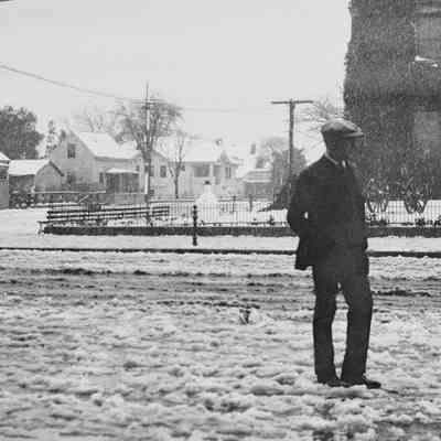 Snow on First Street, 1913. Unidentified man standing at First and G Streets. B/W photo.