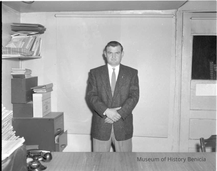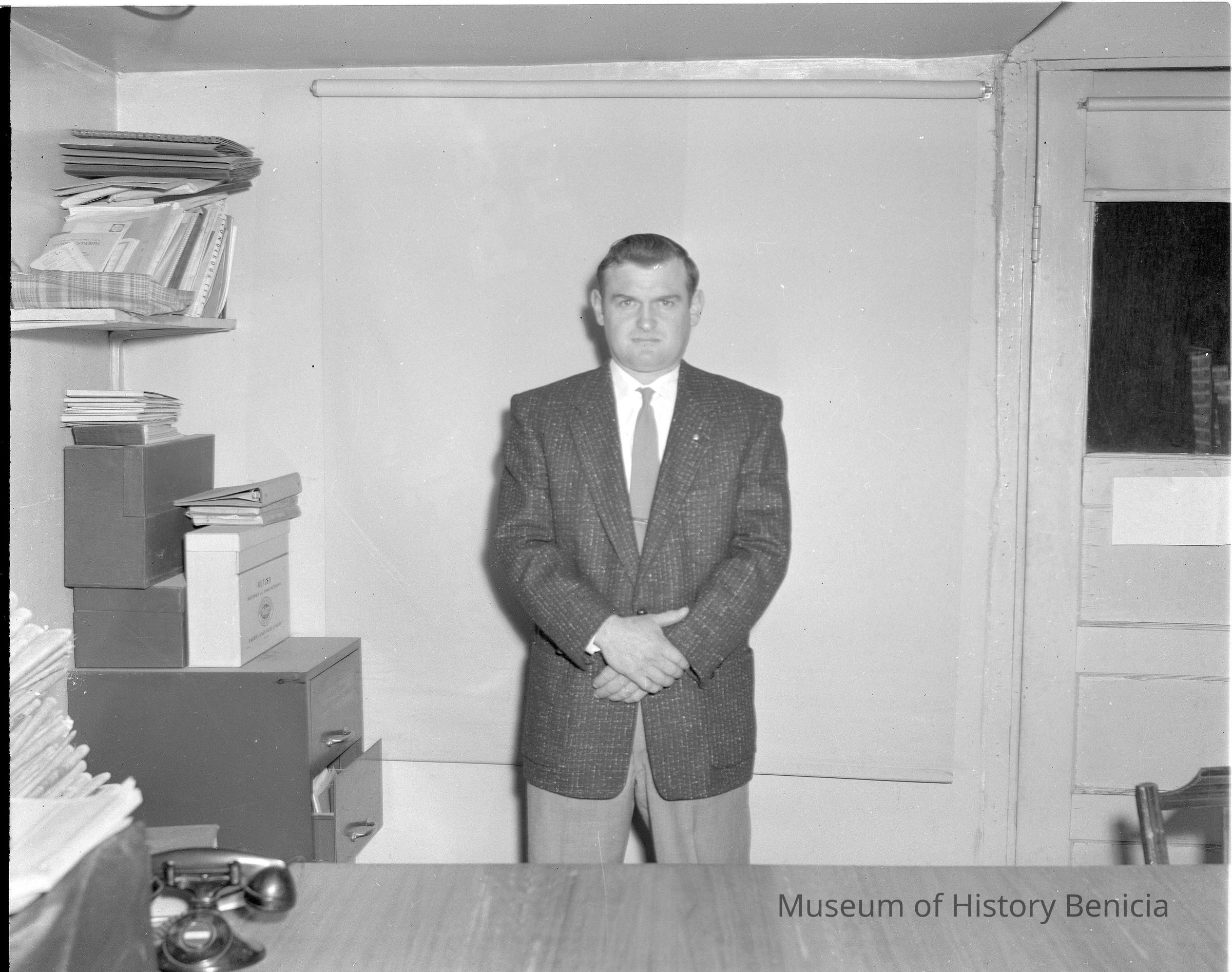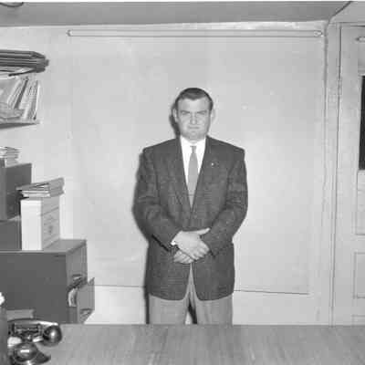 B/W negative. Photo of an office and a man standing in the office. Harry Wassmann has identified the man as Al Cassagrande, a local contractor.Collection