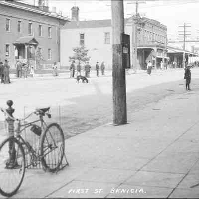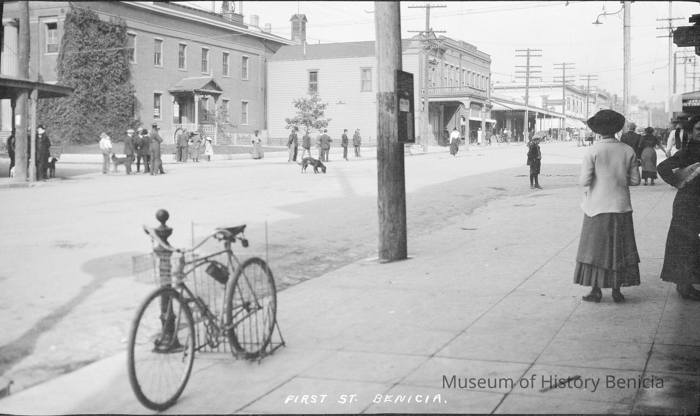 B/W negative. Benicia on First St. Shows a bike in a rack across from the Capitol.