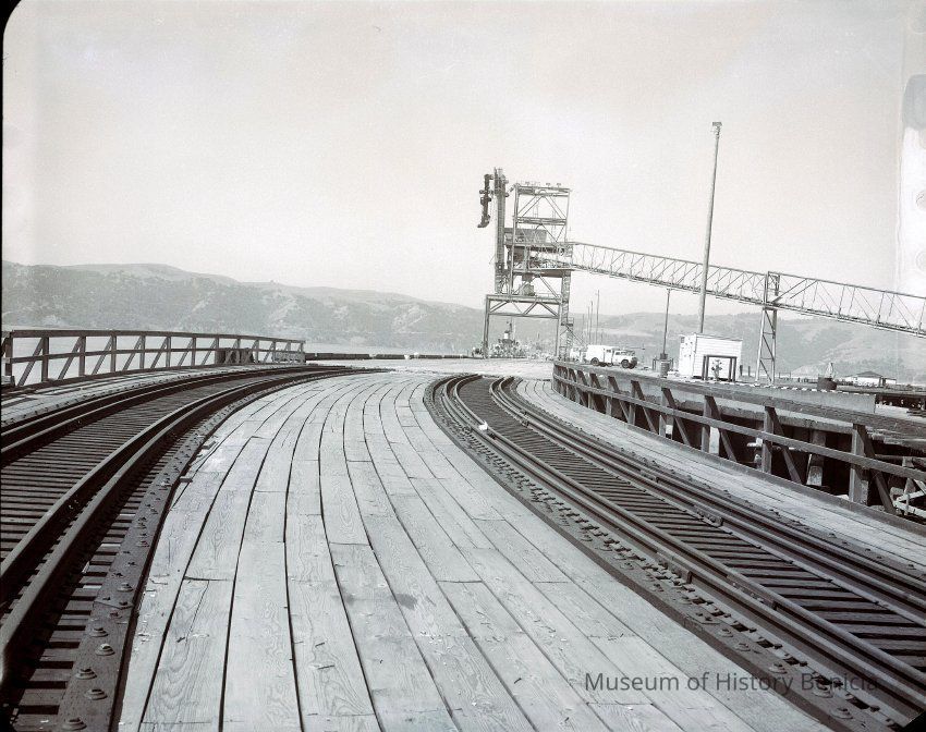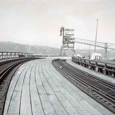 Shows tracks on wharf and a loader in background.Collection