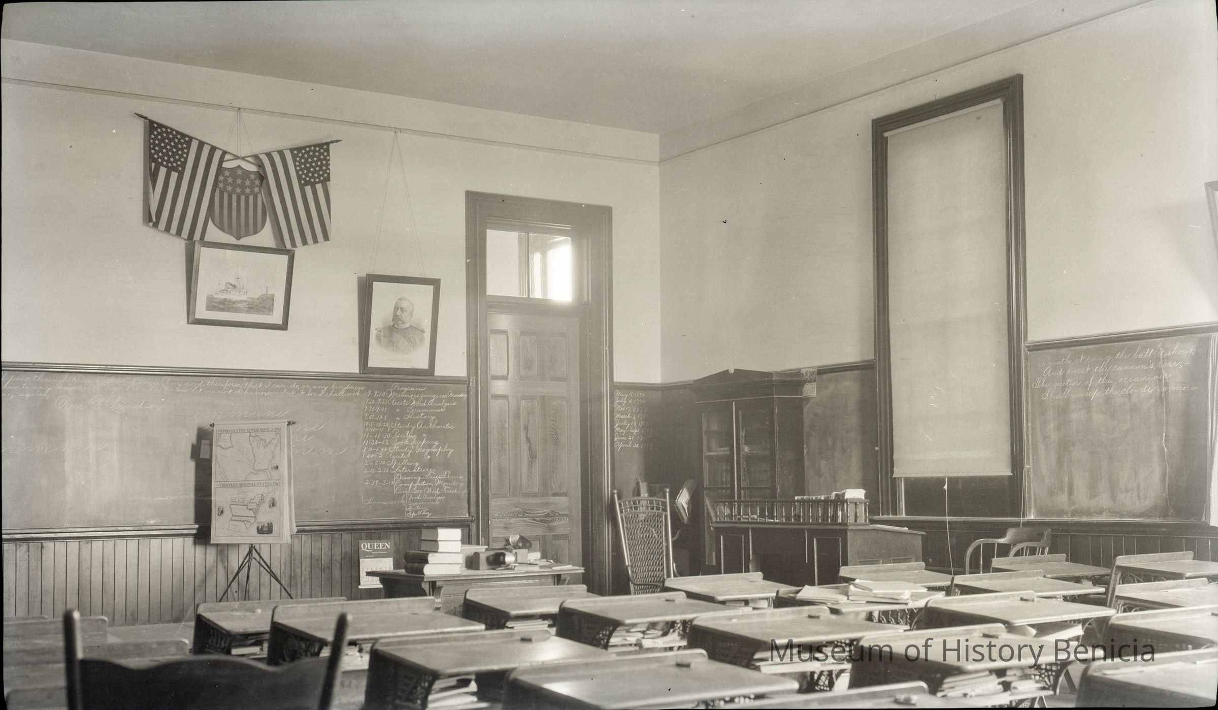 This is negative of a classroom in the old Benicia Grammar School. The room is empty but several things are written on the chalkboard. The "Program" is listed showing: