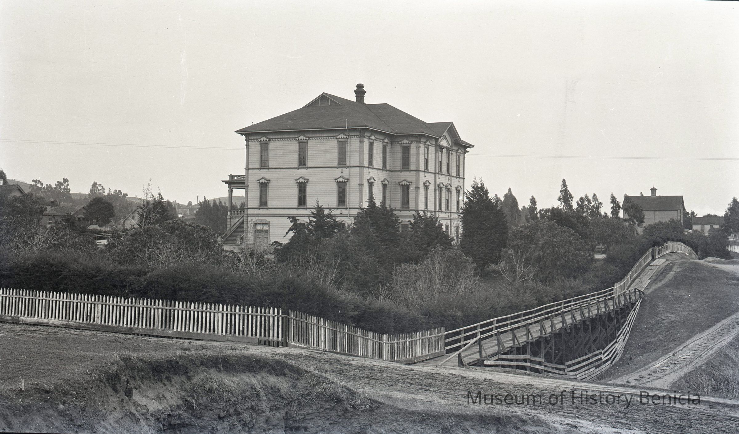 This is negative of the old Benicia Grammar School. It was taken from the back and shows the road and wooden walkway . It is very similar to 2014.011.0231 image except you can see part of the front stairs.Collection