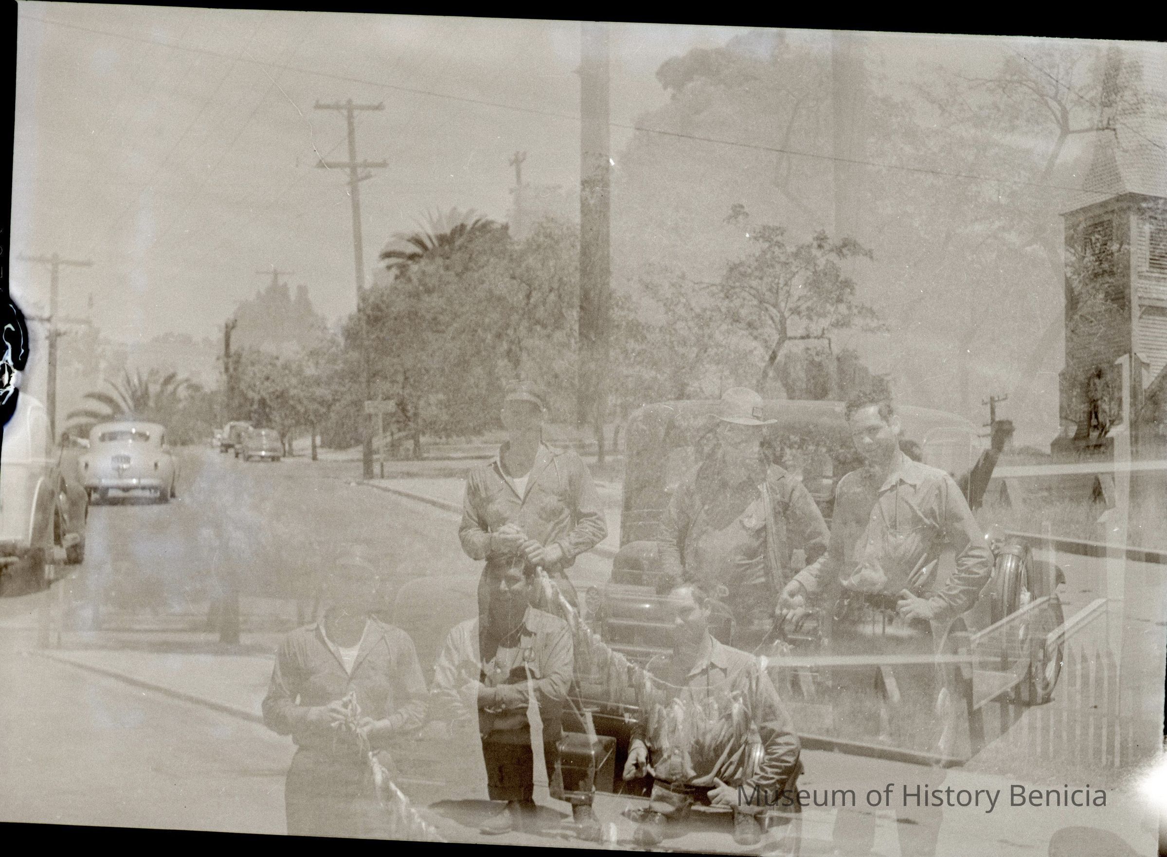 This is negative of a group of men with their fishing catch. It is a double exposure.