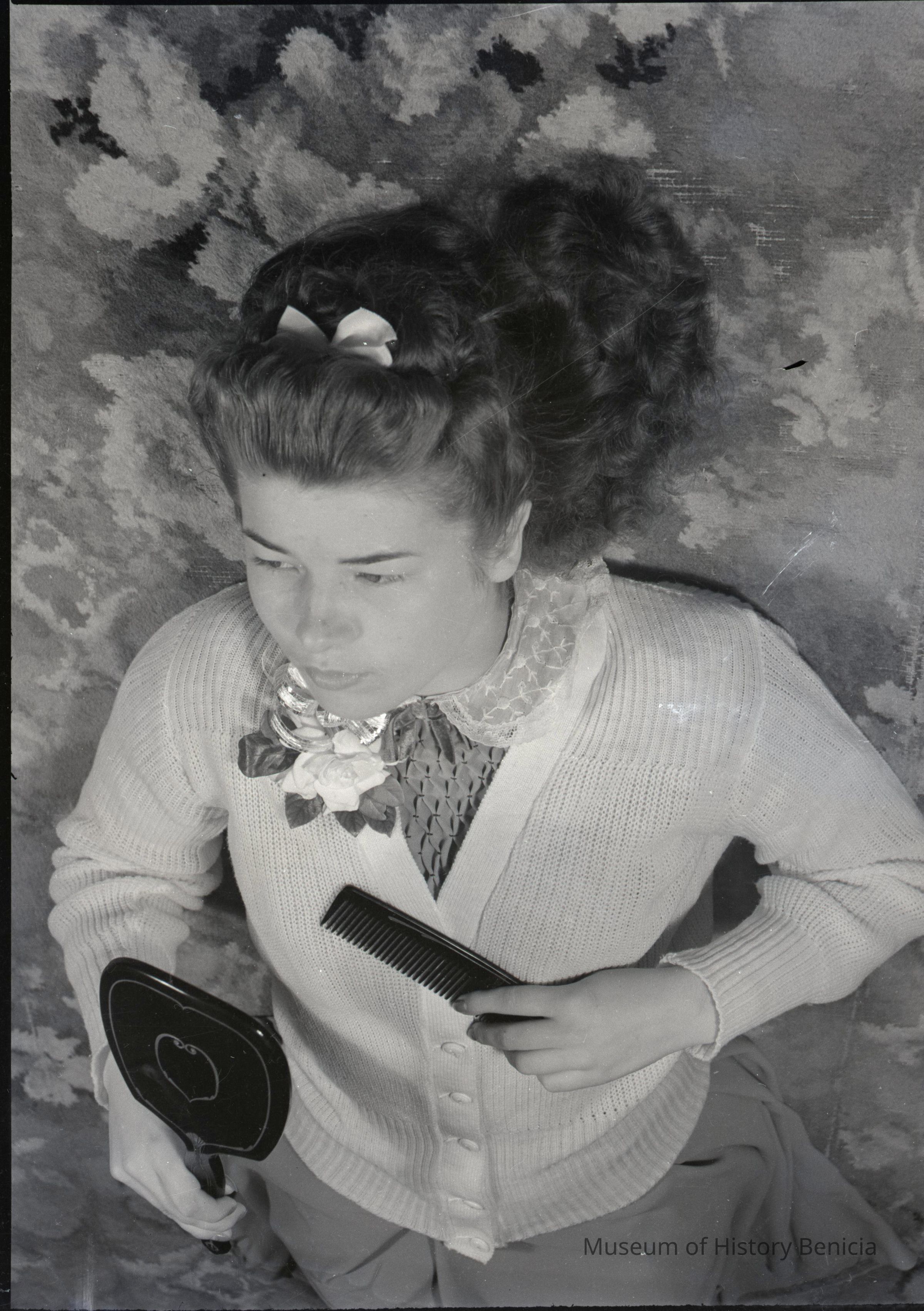 This is negative of a woman with a comb and brush laying on the floor.