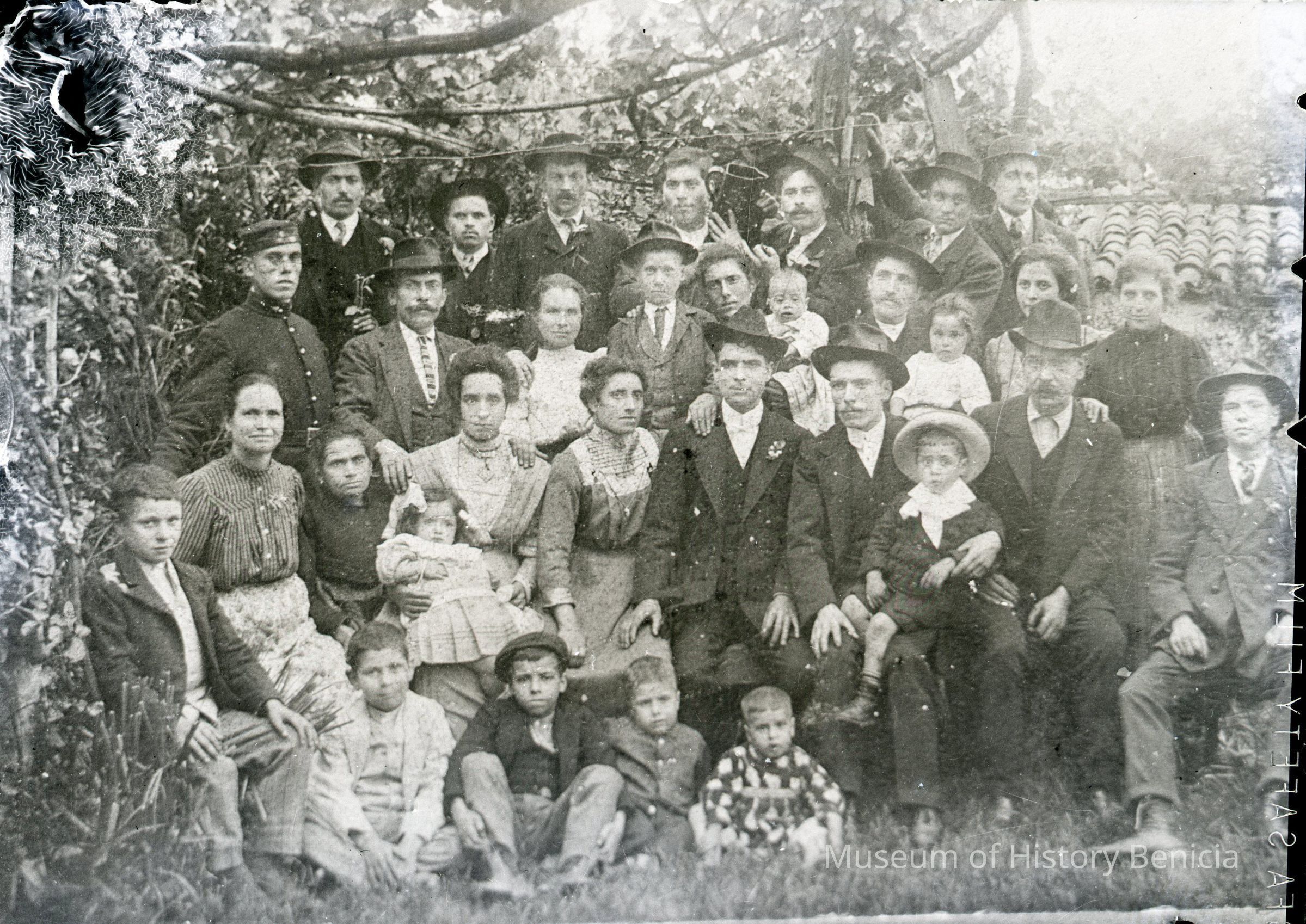 This is copy negative of photo of a large family group. It is hard to know when or where this photo was taken. One man is wearing an unknown uniform and another is holding what looks like a pitcher.Collection