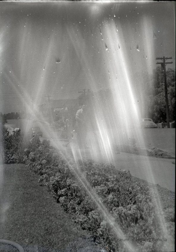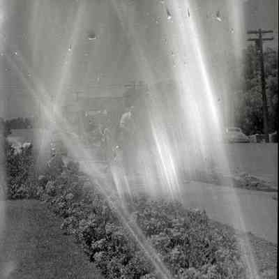 This is negative of someone in their yard next to a bed of flowers.