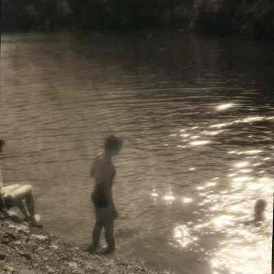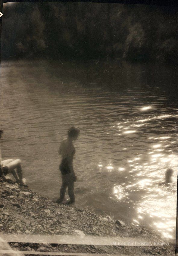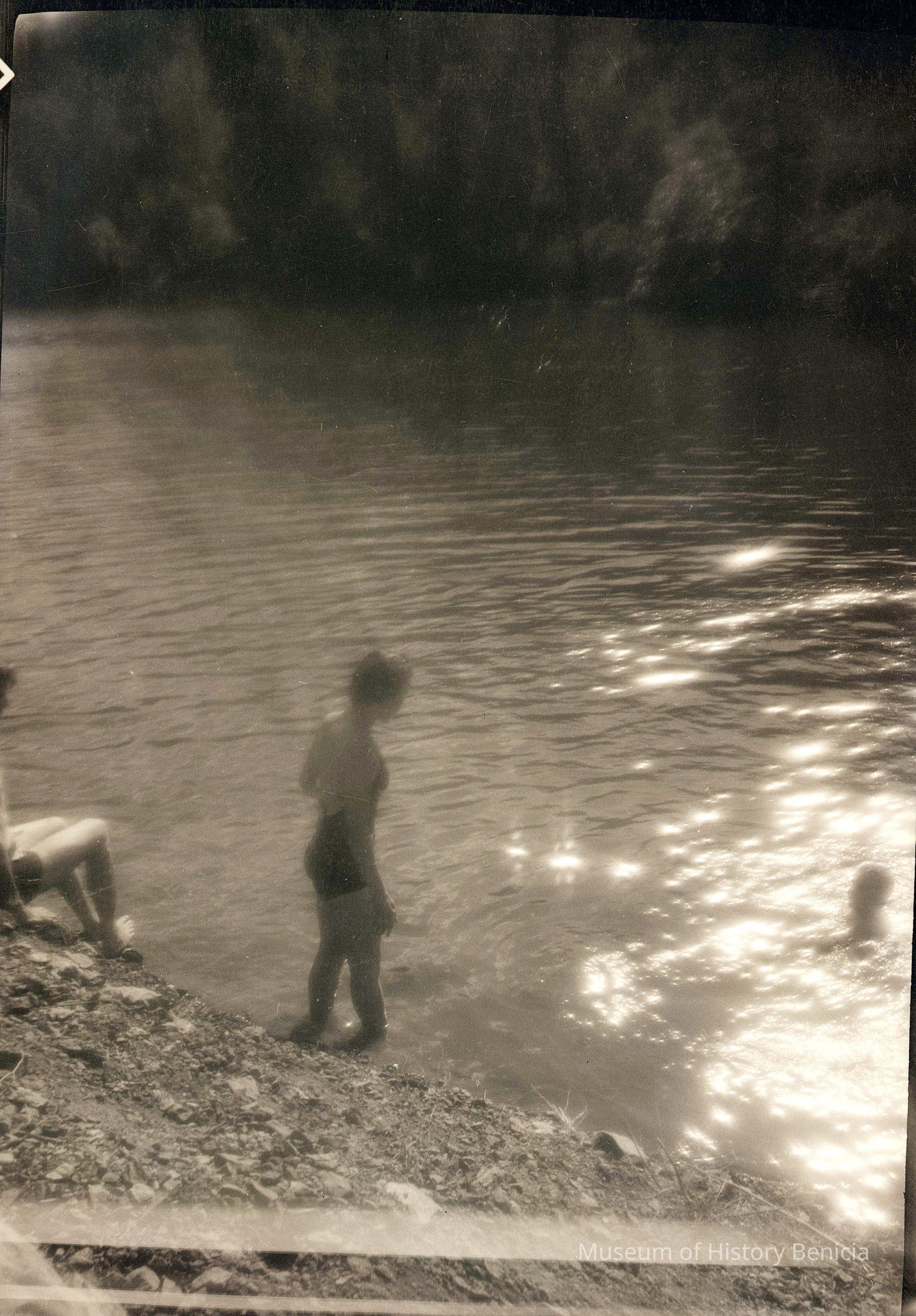 This is negative of a woman dressed in swimsuit entering the water and one other person in the water. You can just see the legs of a third person on the bank.Collection