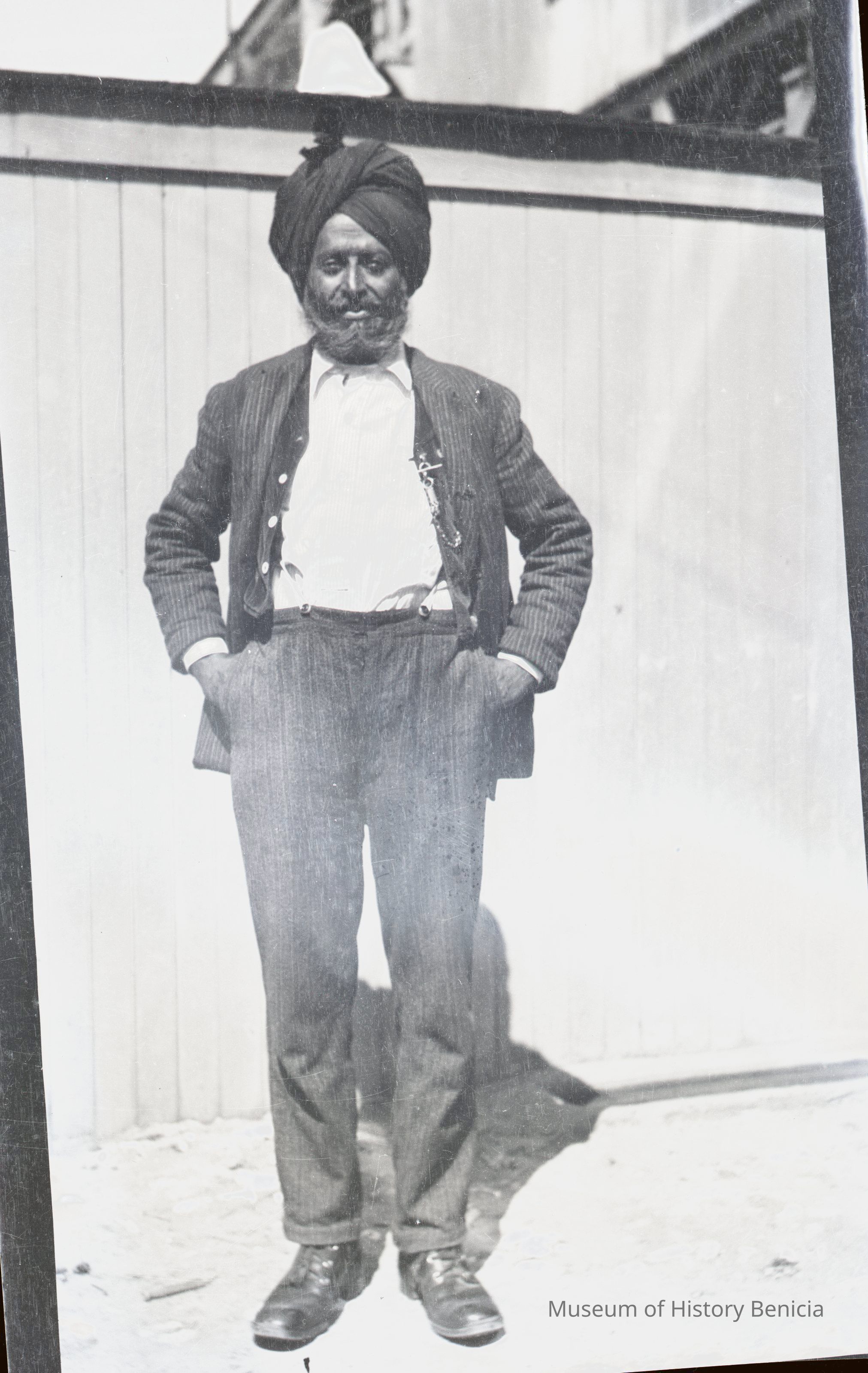 This is negative of a man with a turban standing in front of a fence.