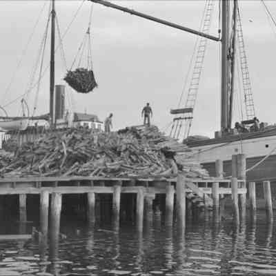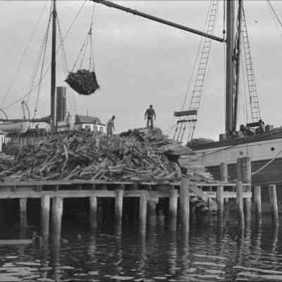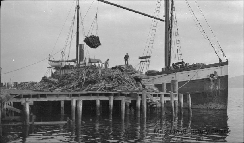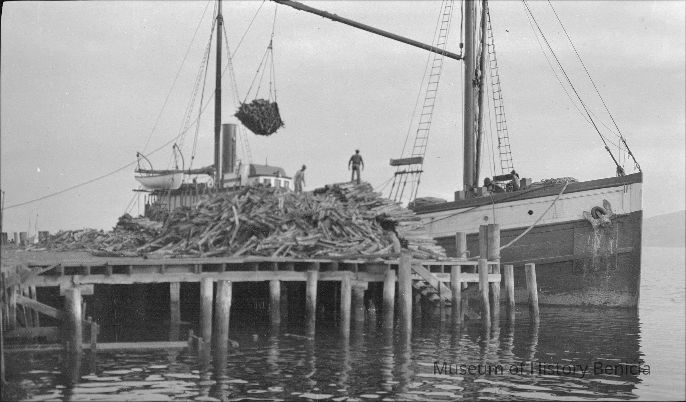 B/W Negative: A load of tanbark being unloaded at the Benicia wharf. The tanbark was used at the Kullman Salz Tannery.