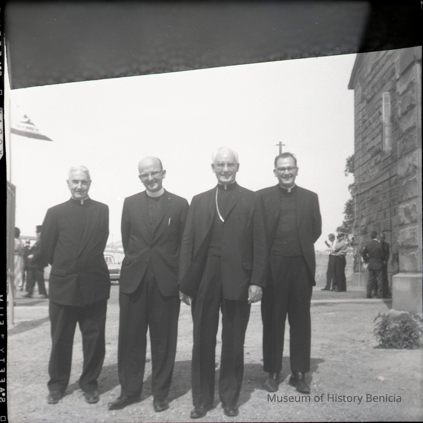 This negative shows four priests standing next to a school. This could be the Maritime Academy.Collection