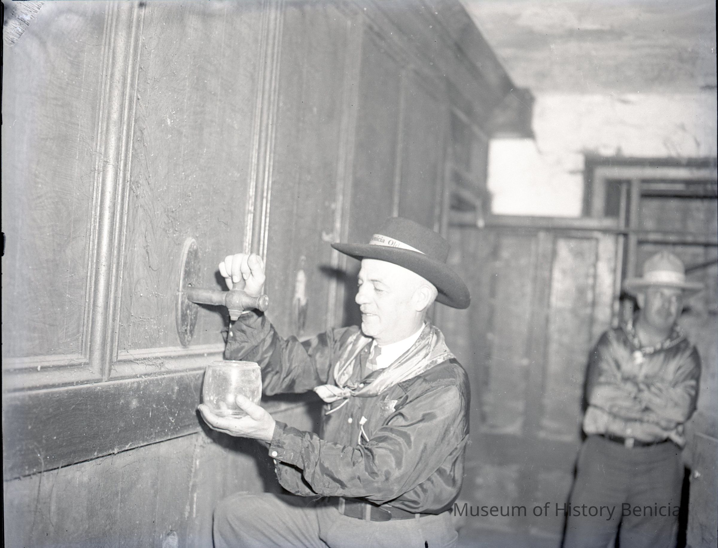 One man is drawing a beer from a tap. His hat says Benicia Old Timers.Collection