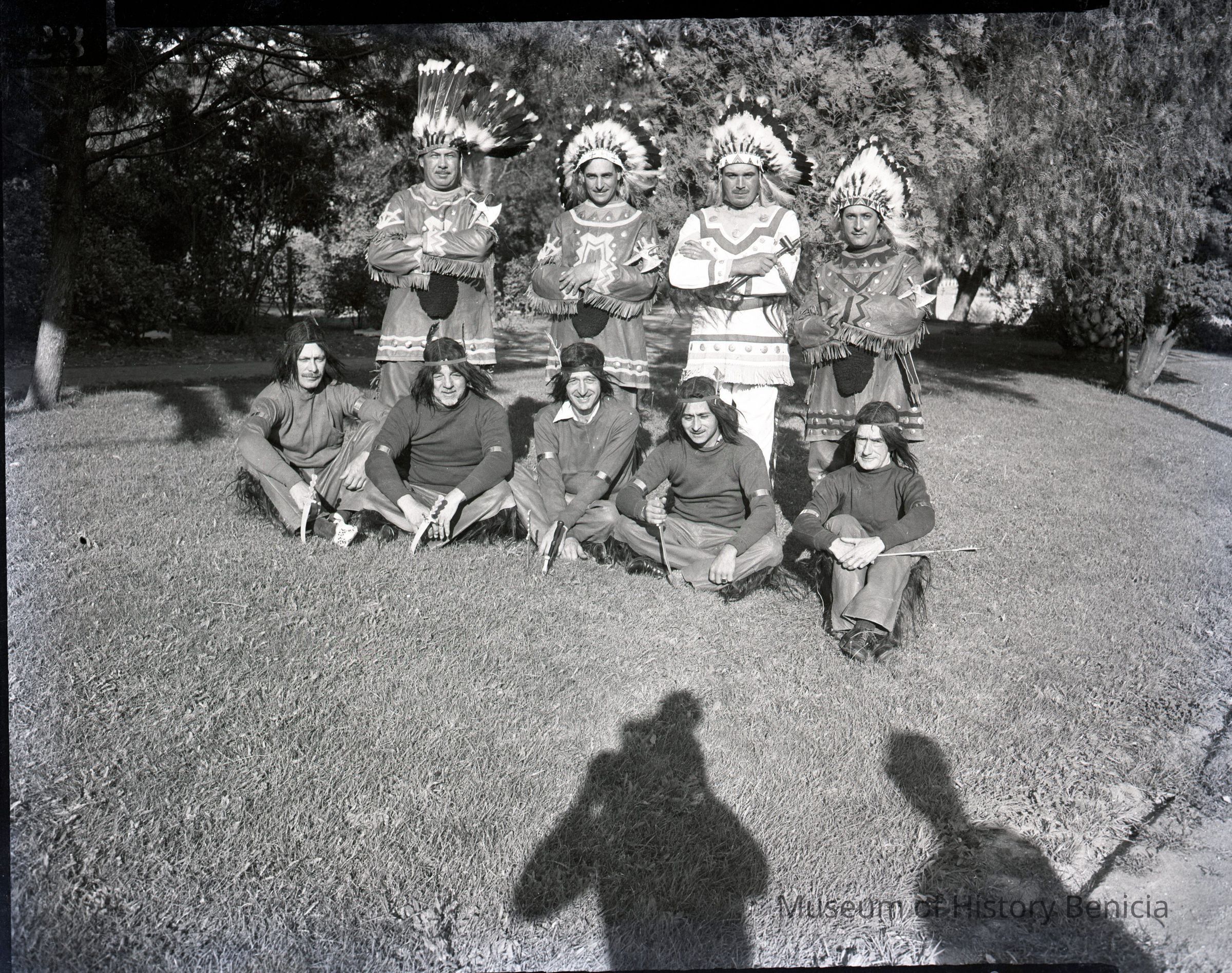 Men dressed as Indians are seated and standing in the park. These are probably members of the Redmen Society who are participating in the Old Timers celebration.Collection