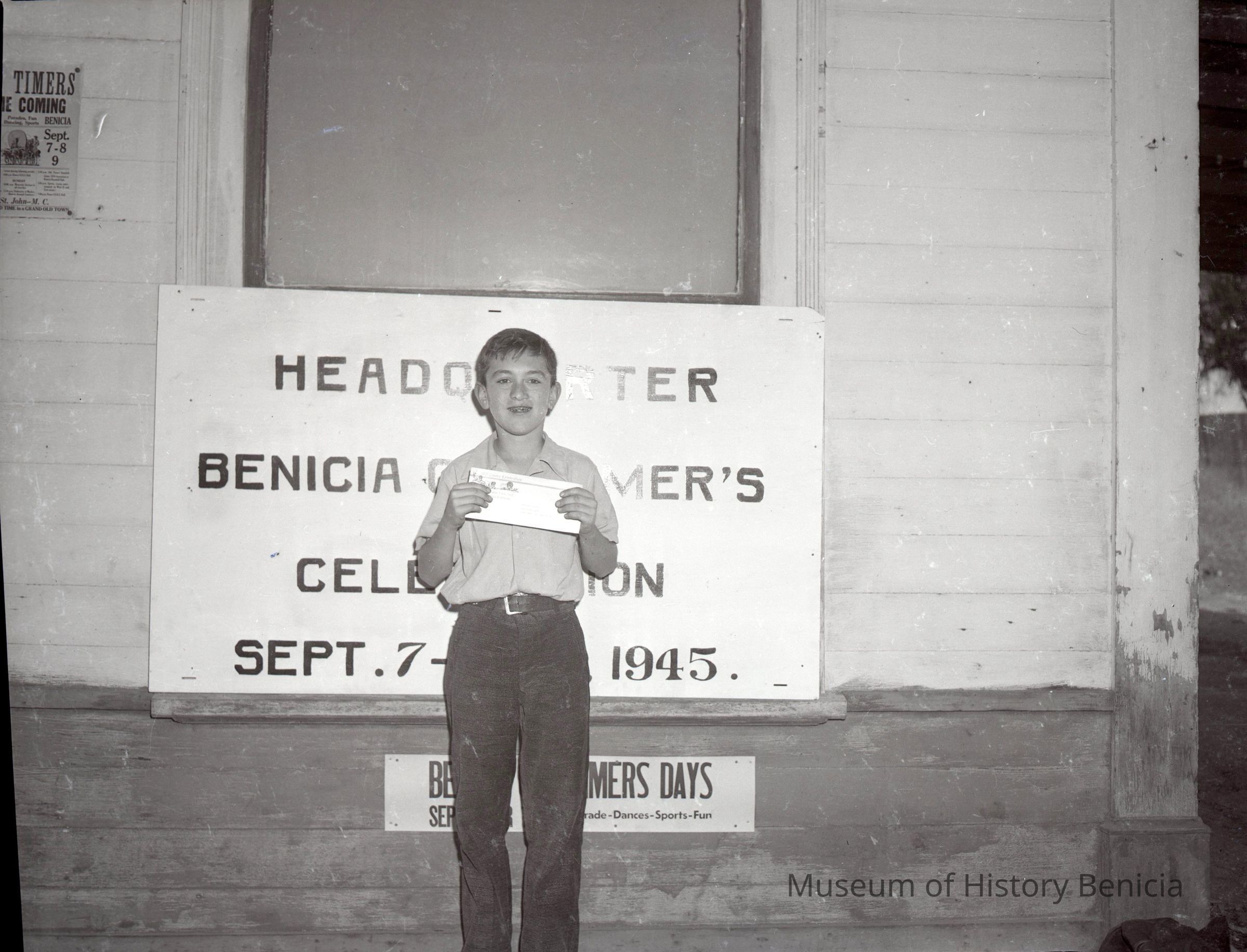 Photo of Old Timers poster and a young boy standing in front. The sign advertizes the 1945 Old Timers celebration. Photo of Old Timers poster and a young boy standing in front. The sign advertizes the 1945 Old Timers celebration. This is a photo of Jimmy Hayes, 13 year old freshman. He was the first place winner of the Old Timers essay contest in 1945. He won $7.50 prize for first place.Collection
