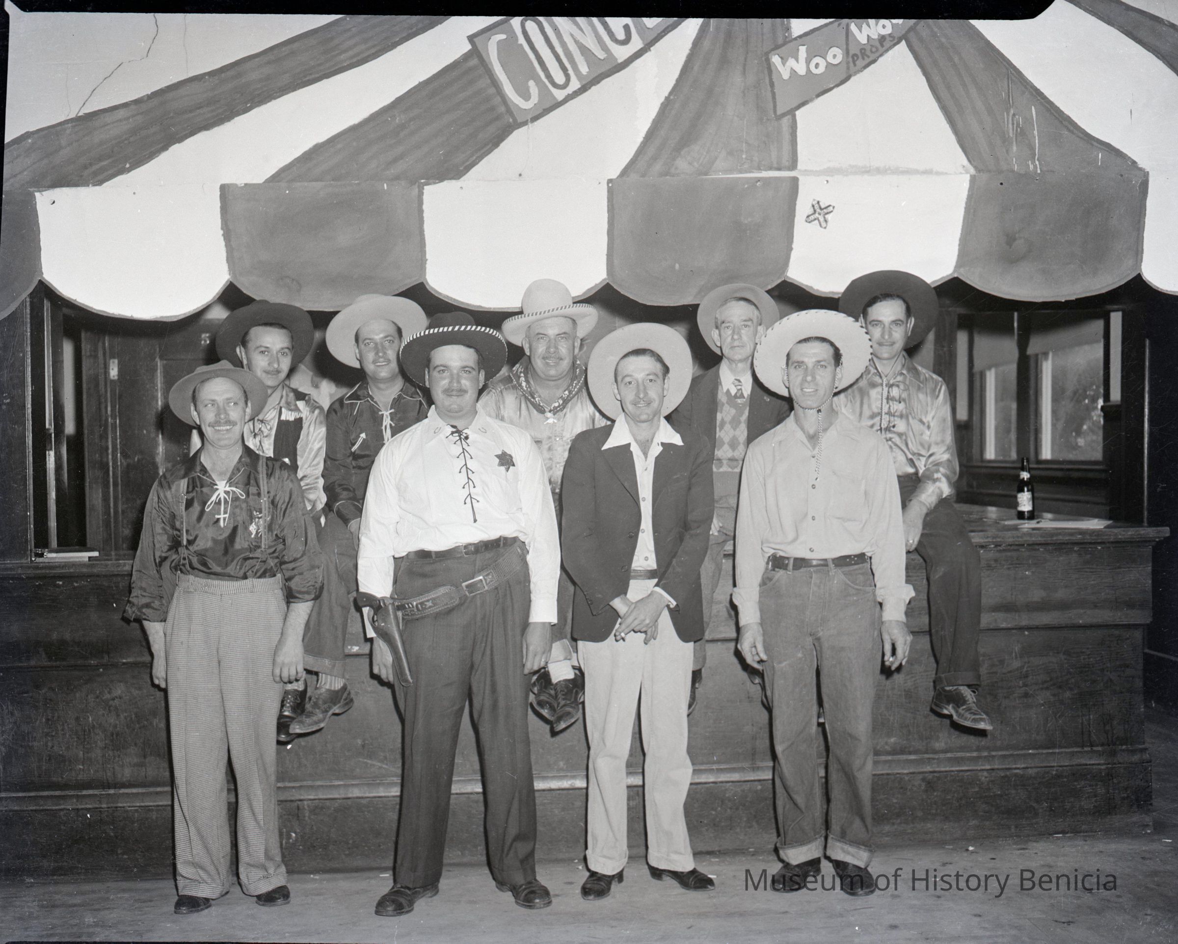 Men dressed as cowboys standing under an umbrella.Collection