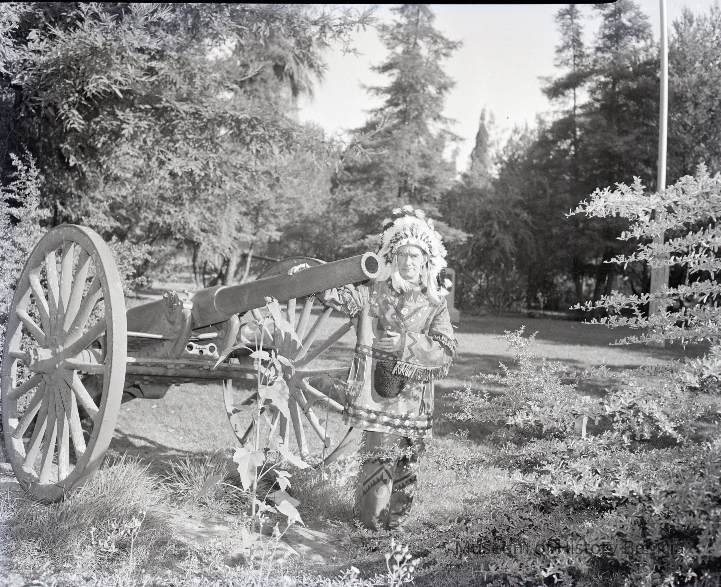 A man dressed as an Indian is standing next to a canon.Collection