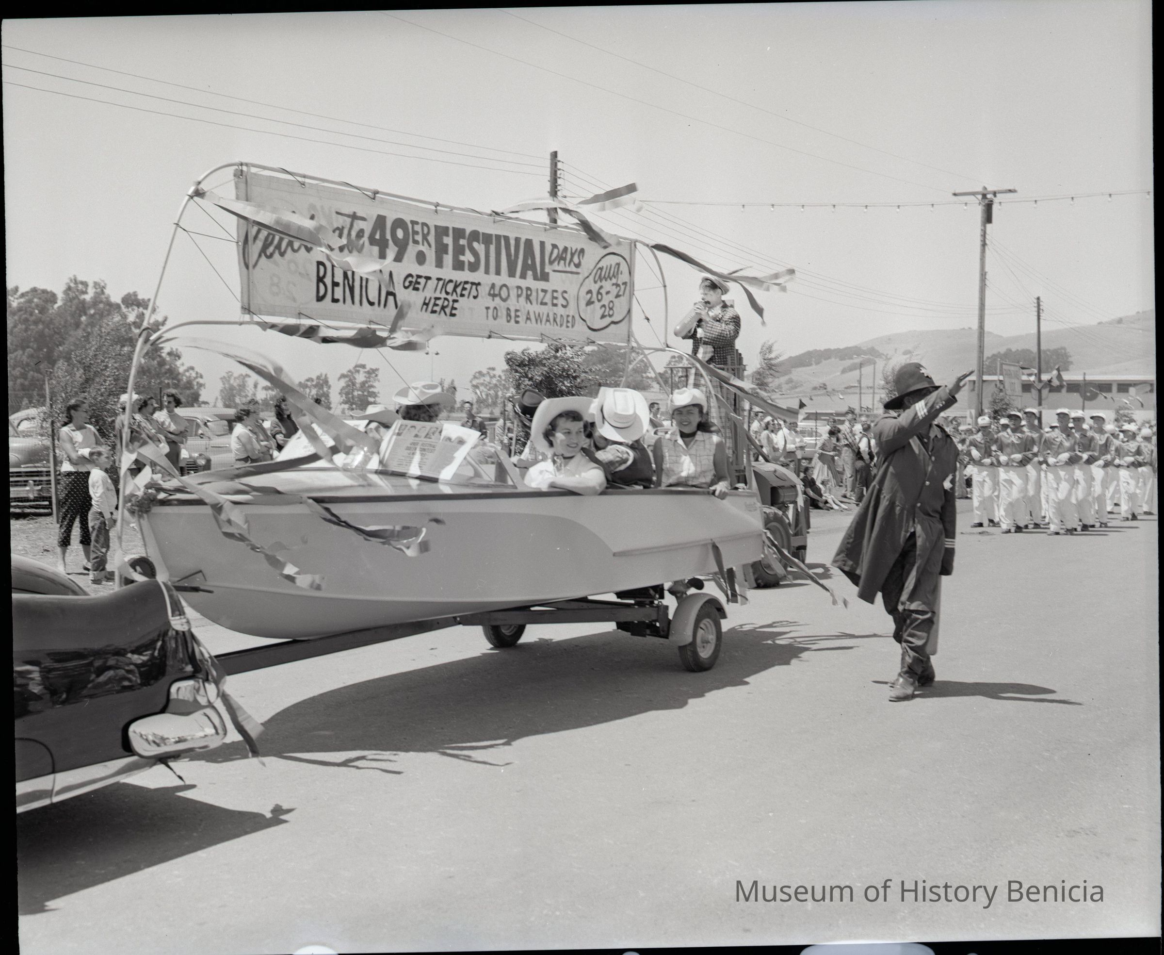 Photo of women posed in front of a boat. This is part of the 1955 Old Timers celebration. There is a large banner behind them advertizing the 49er celebration.Collection