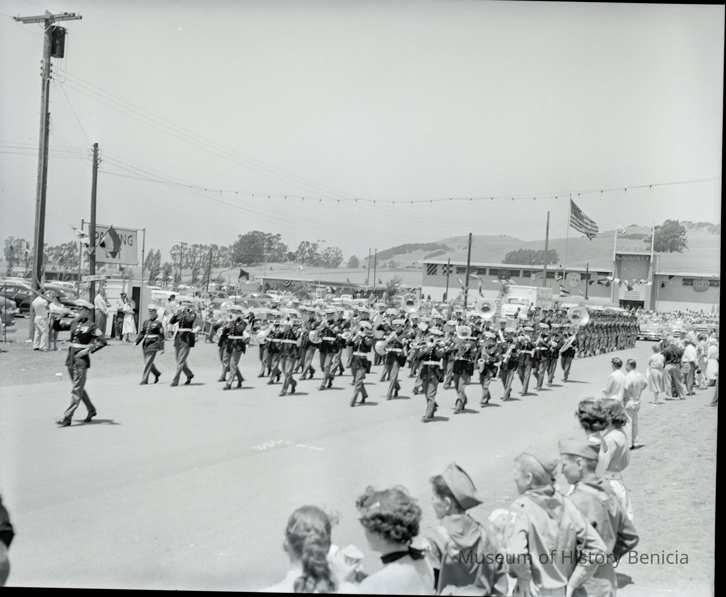 Photo of a parade being held at the Solano County fairgrounds. Shows a marching military band. Probably in support of the 1955 49er celebration.Collection