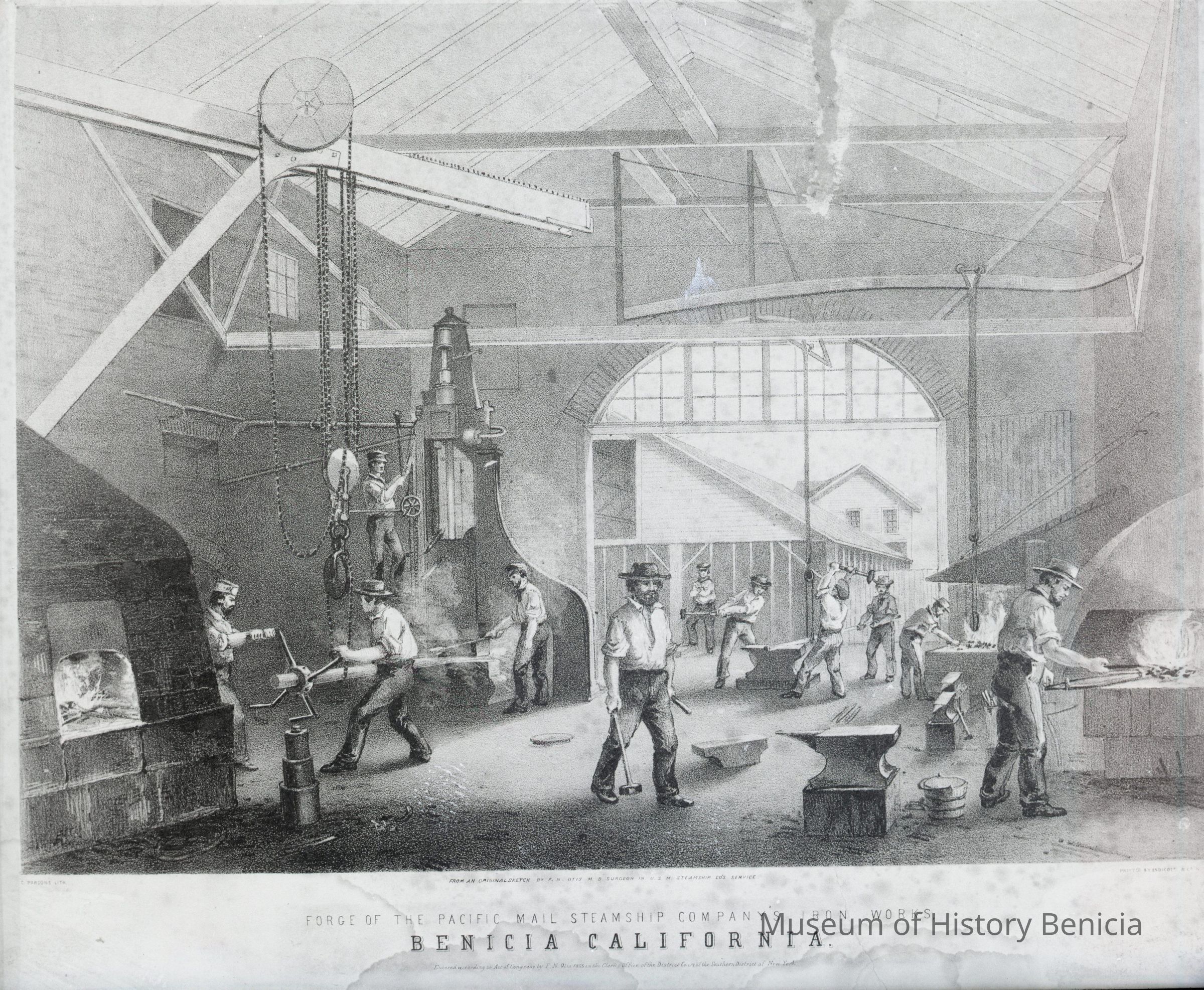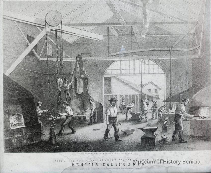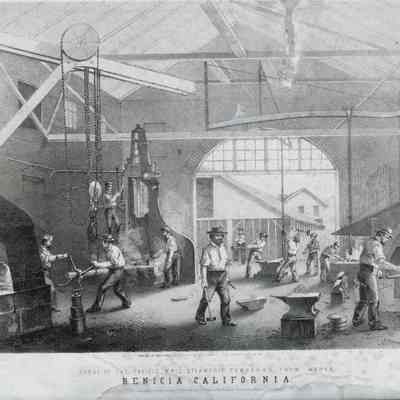 B/W Negative of a Lithograph: Pacific Mail and Steamship foundry. P.M.& S. ships were repaired and serviced at the Benicia plant from 1859-69.Collection