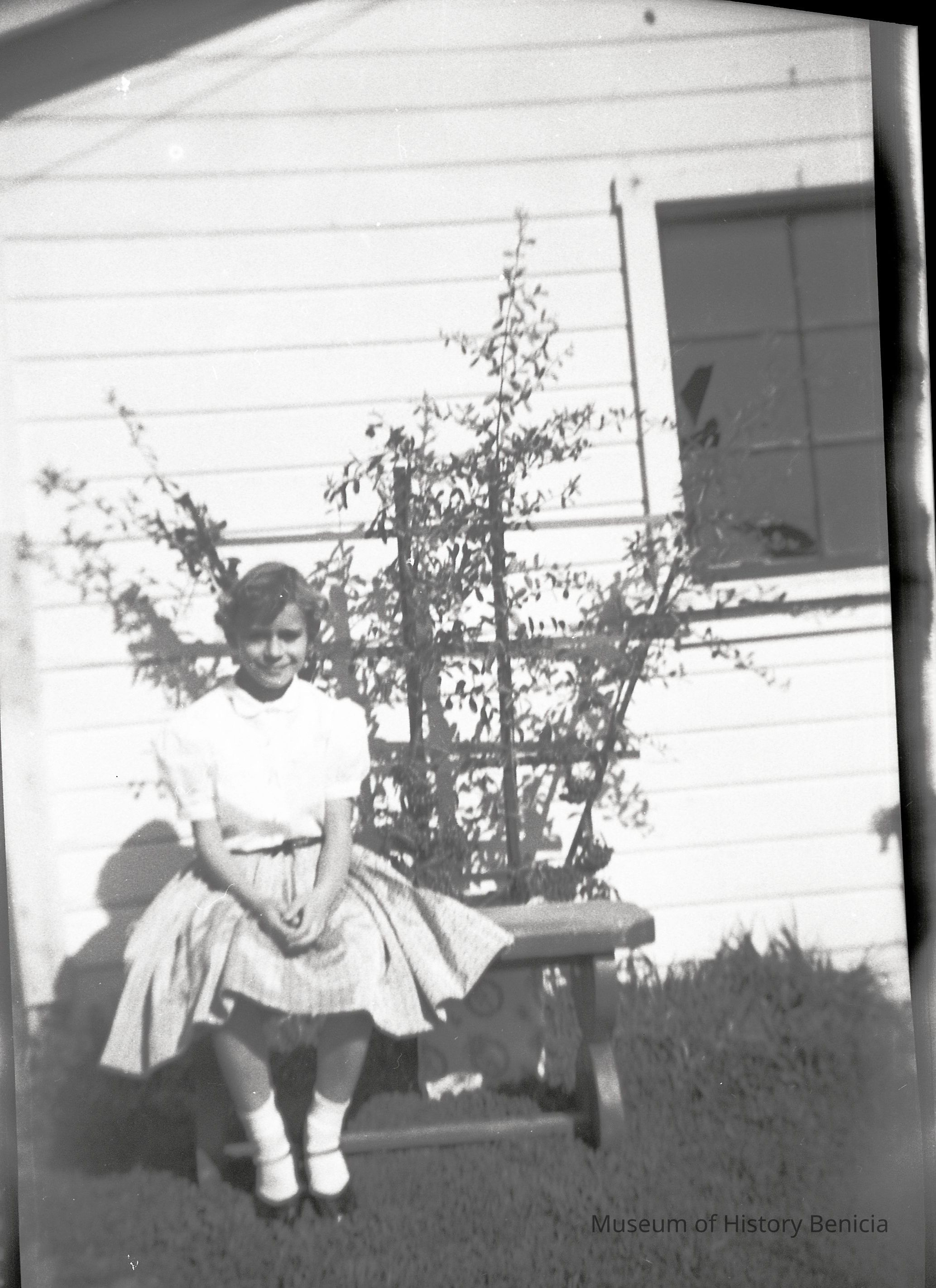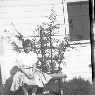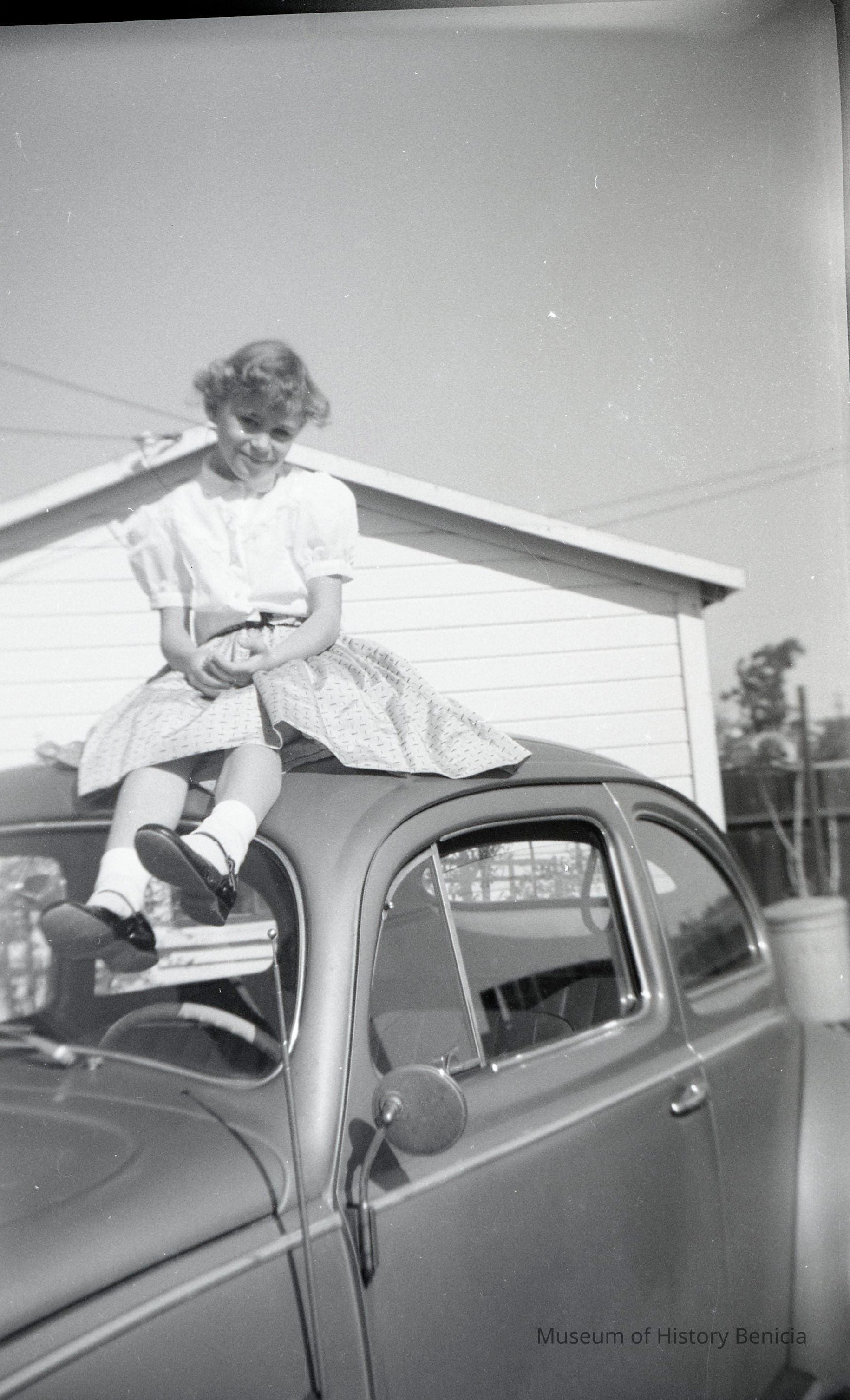 This is two photos on a single strip negative. One image is of a young girl sitting on top of a car. The other shows the same girl net to a trellis.Collection