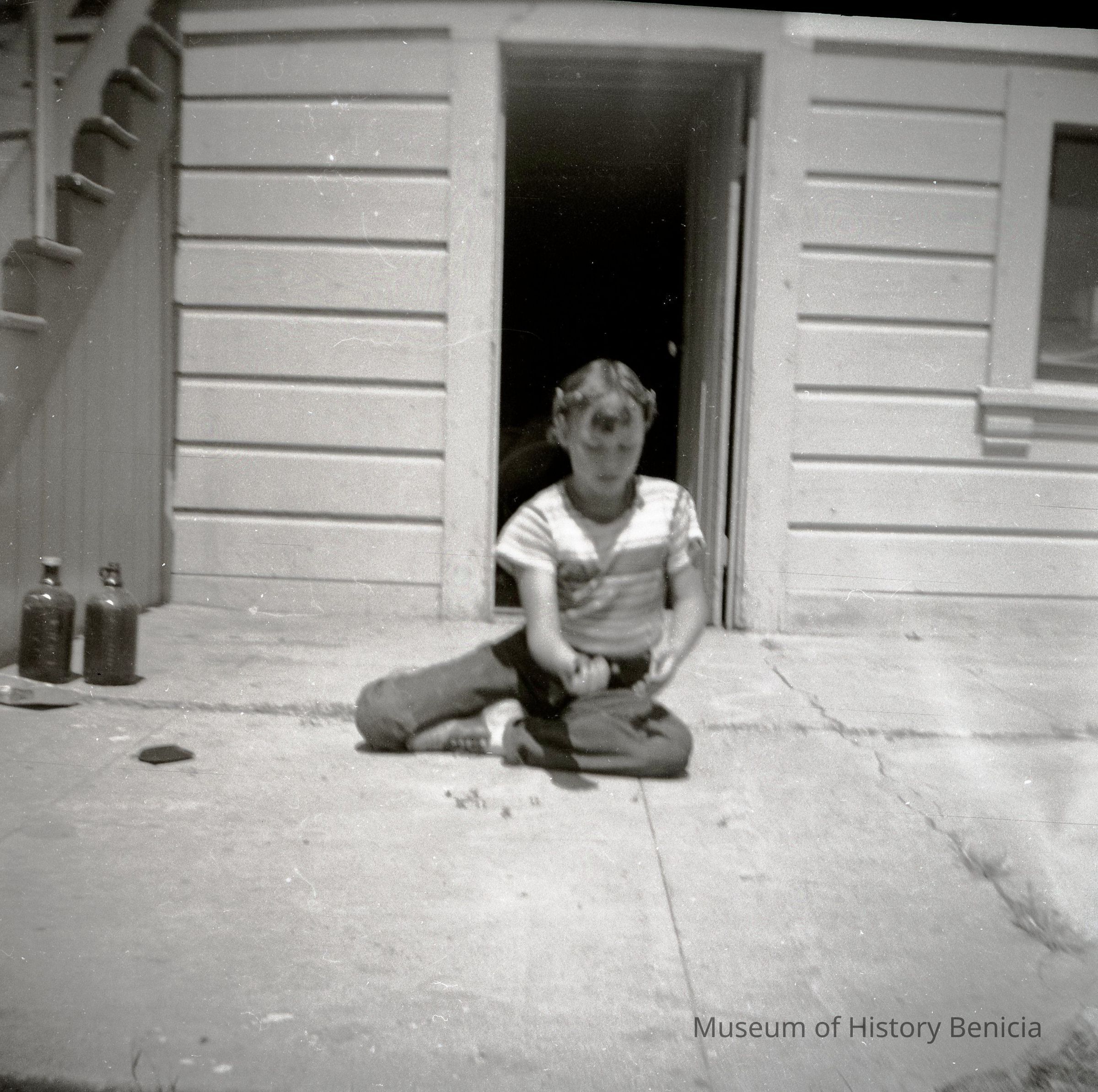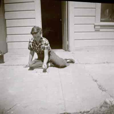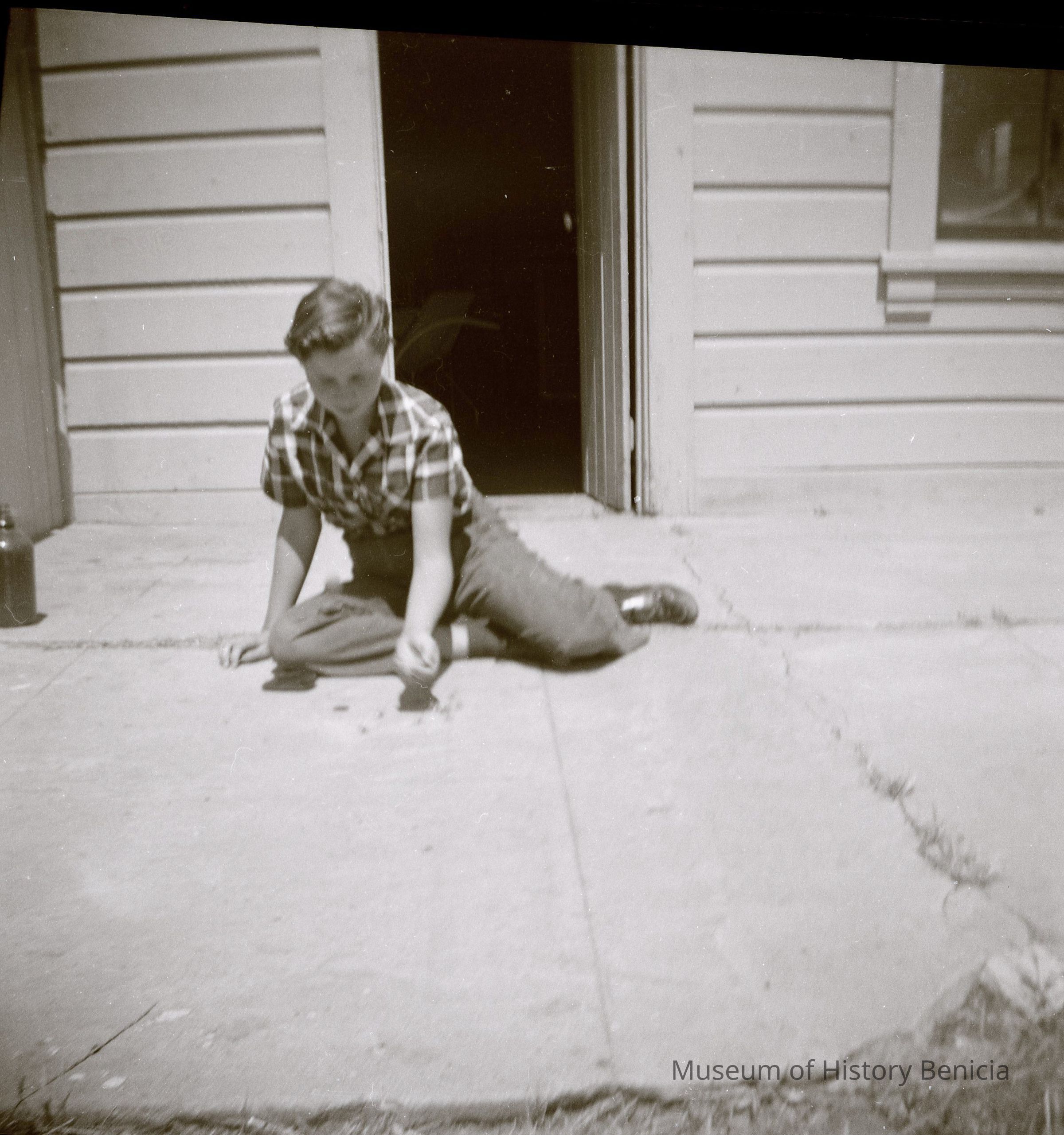 This is two photos on a single strip negative. Both negatives show a child playing "Jacks". One is a boy and the other is a young girl.Collection