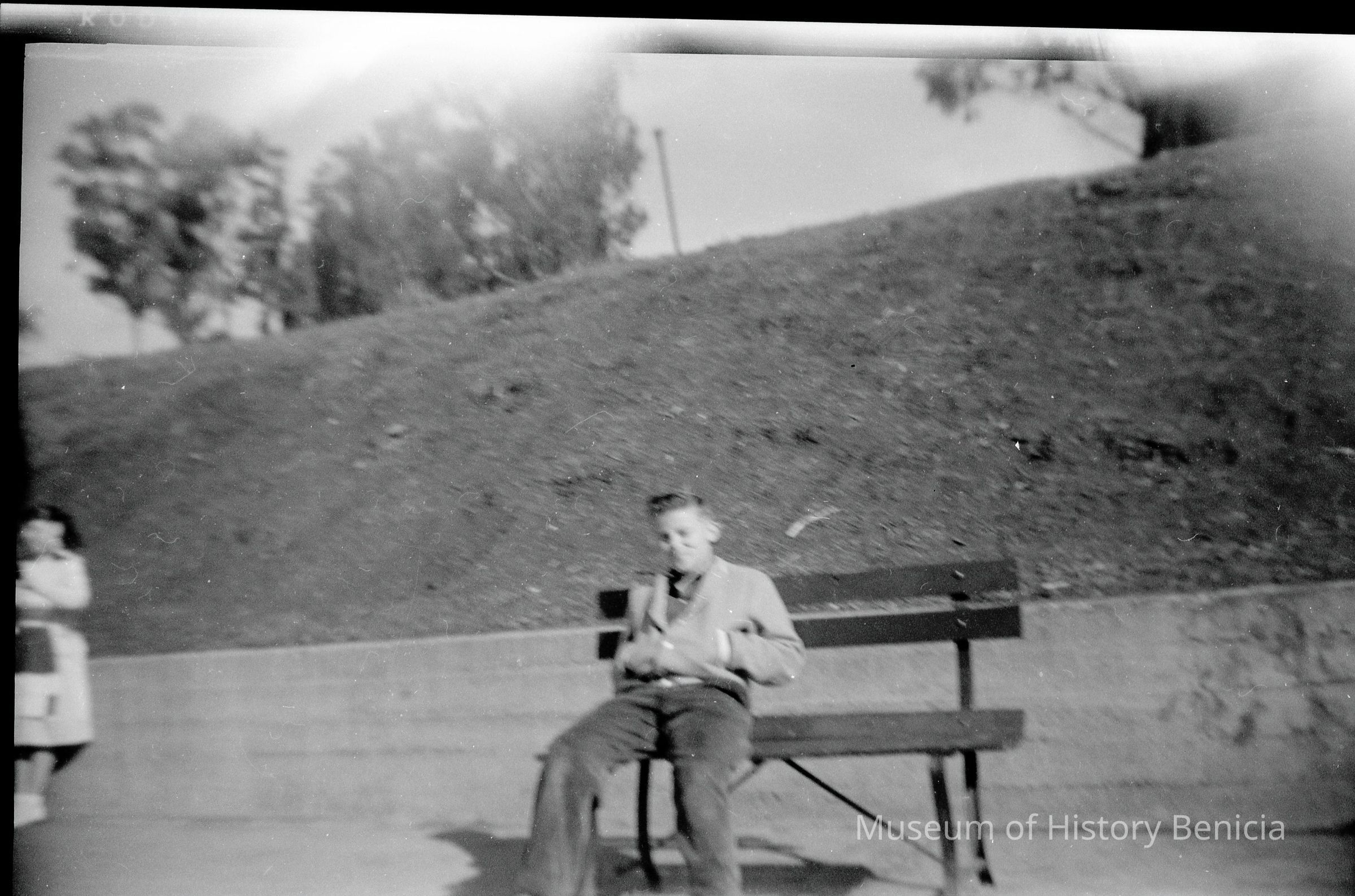 This is two photos on a single strip negative. Both negatives show people sitting on a bench.