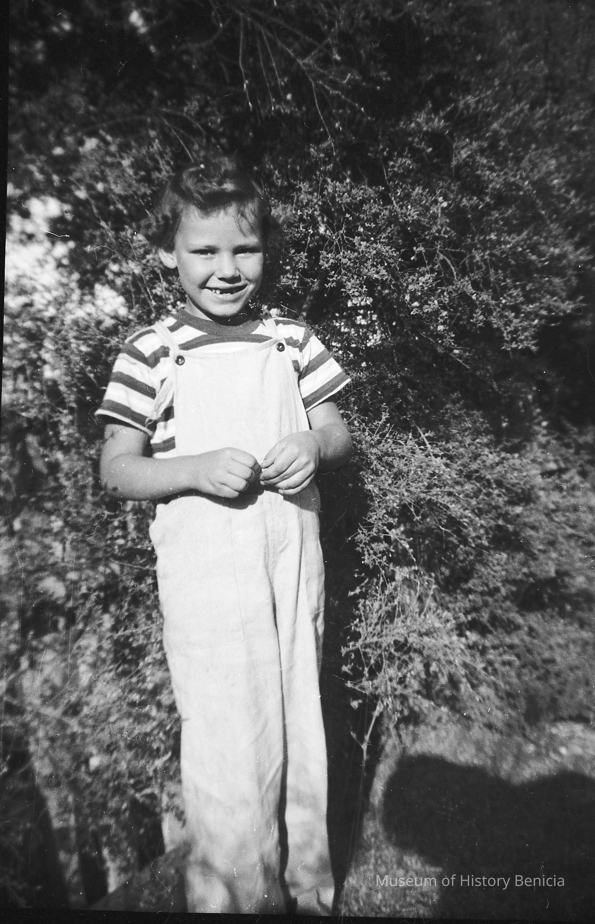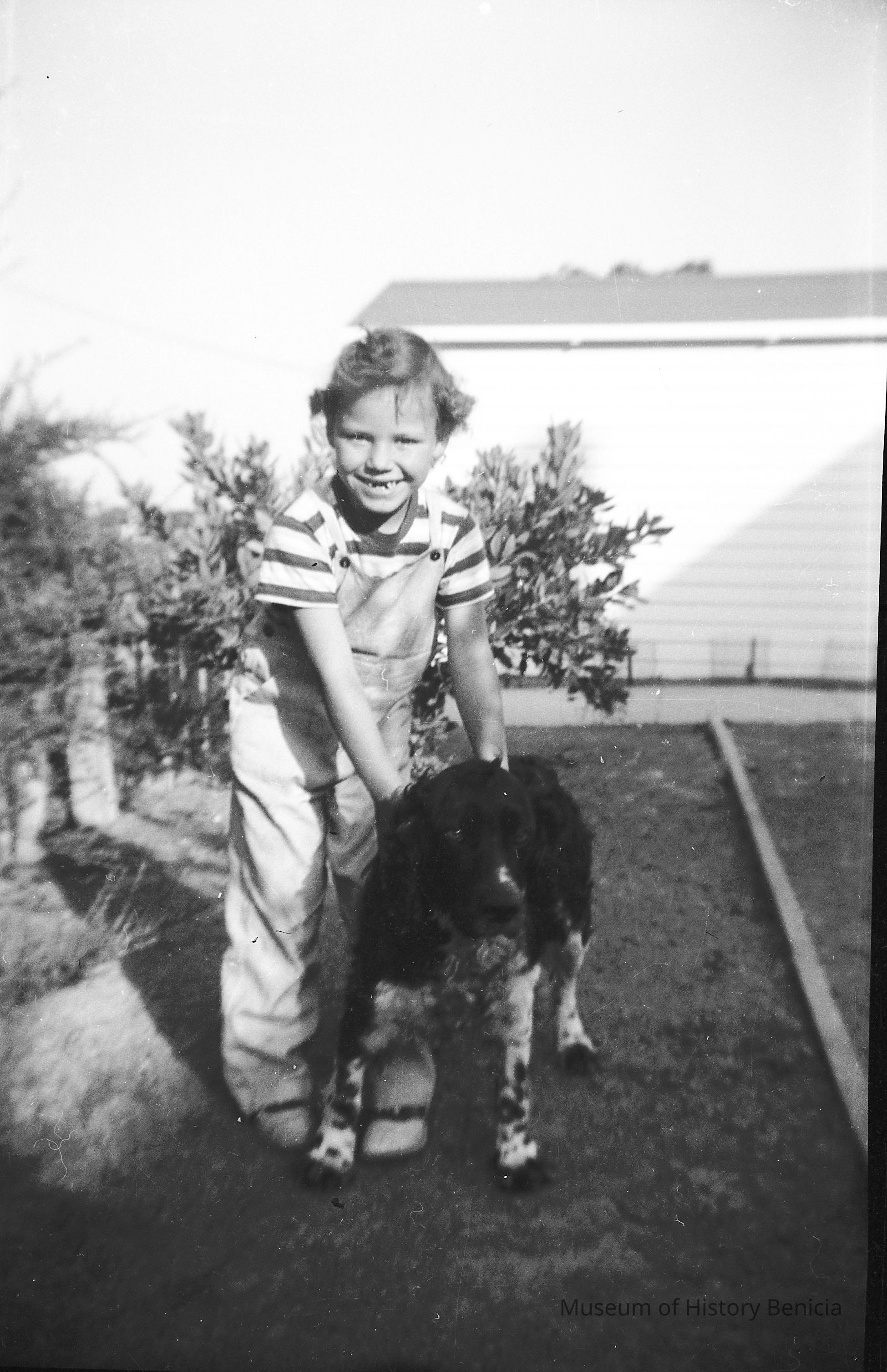 This is two photos on a single strip negative. One image is of a young girl in overalls and her dog. The other is of the same girl standing in front of bushes.Collection