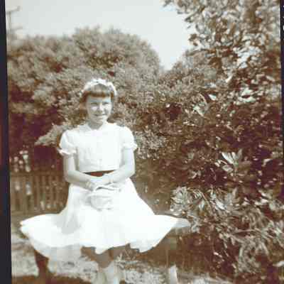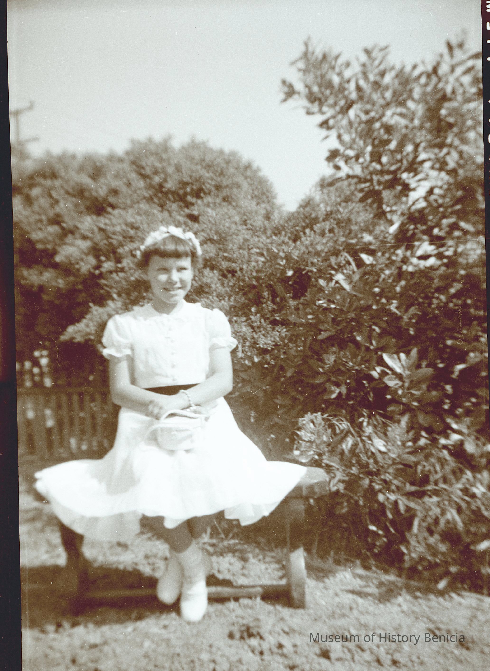 This is two photos on a single strip negative. One image is of a young girl sitting on a garden bench. The other is of the same scene.Collection