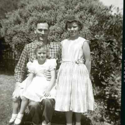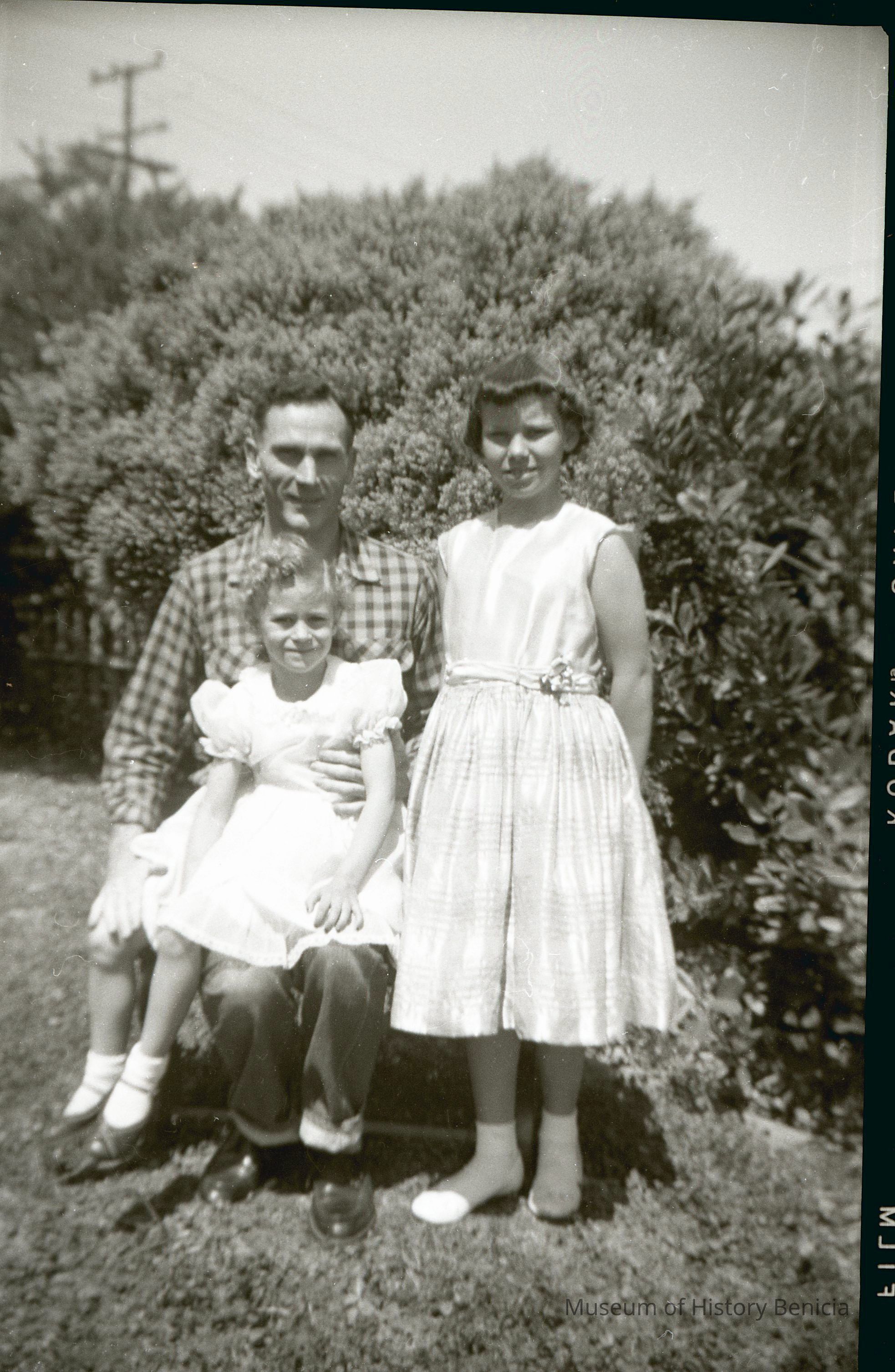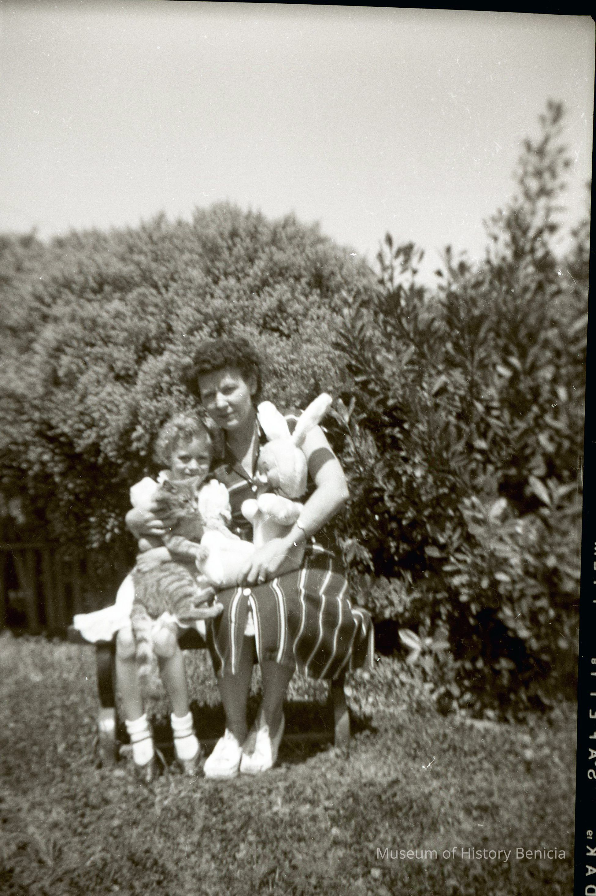 This is two photos on a single strip negative. One image is of a mother, a cat, a stuffed rabbit and her daughter. The other is Harry Wassmann with two girls.Collection