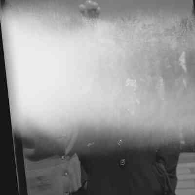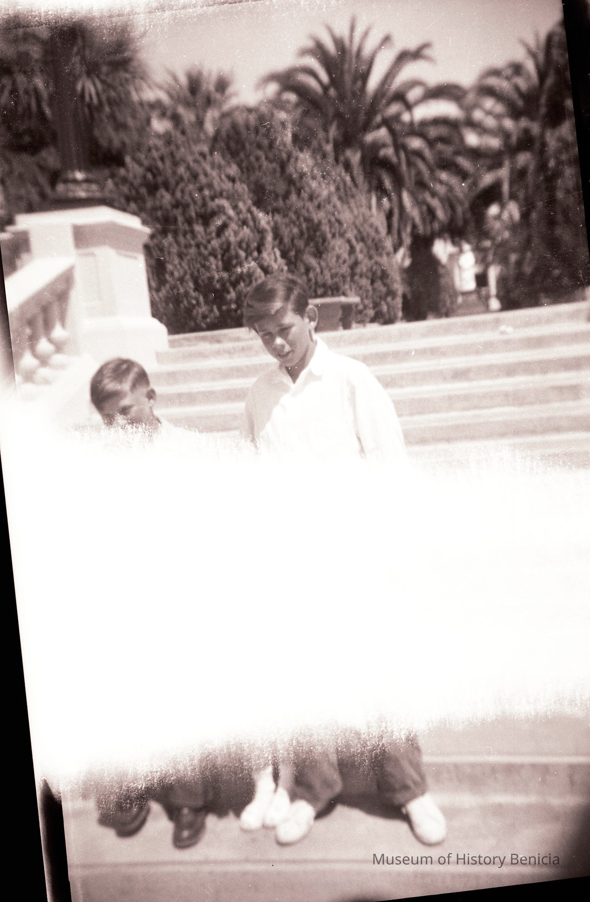 This is two photos on a single strip negative. Both images are very badly light damaged. In one you can make out two boys standing on steps. The other is hard to distinguish anything.Collection