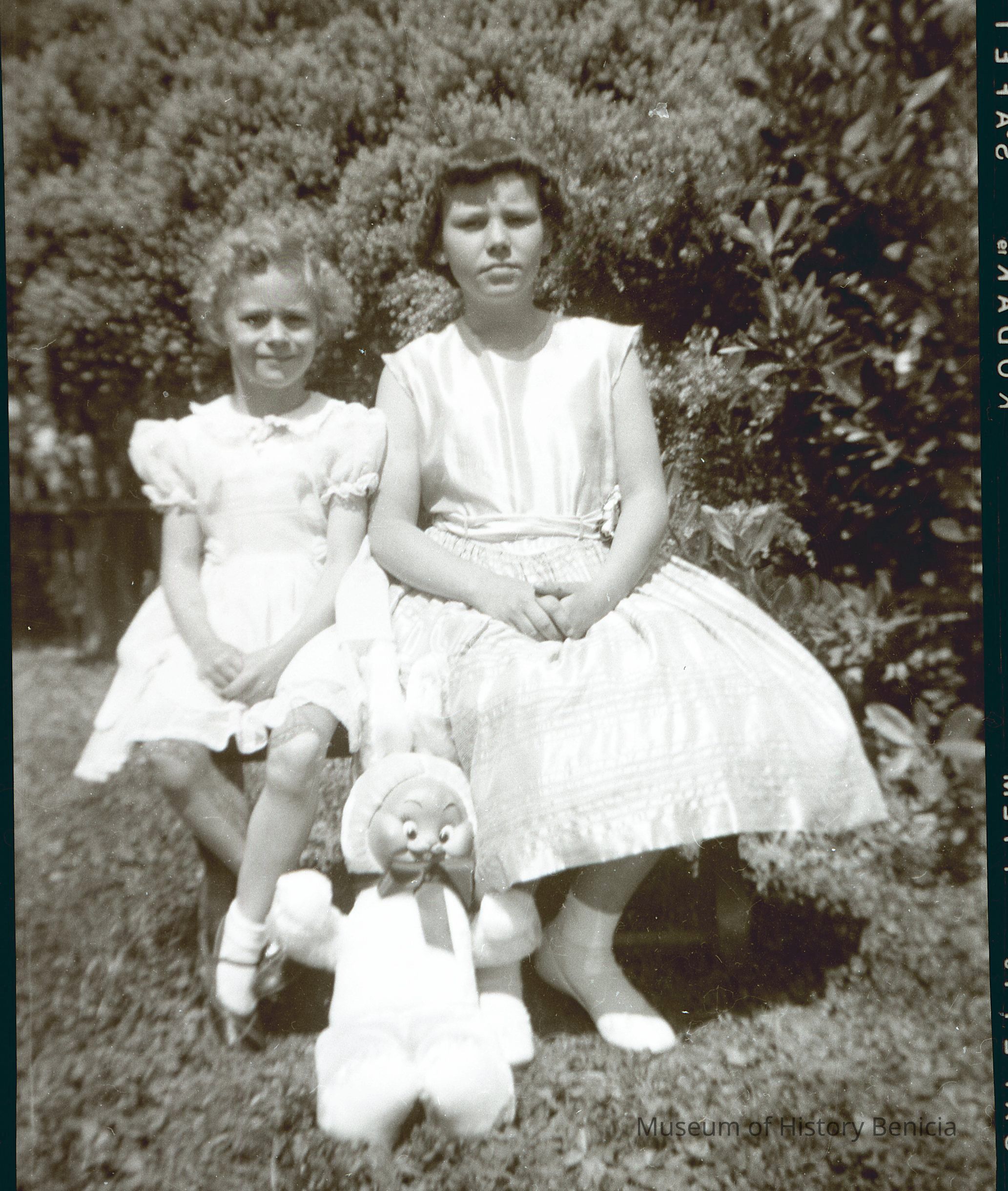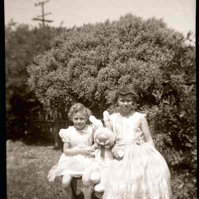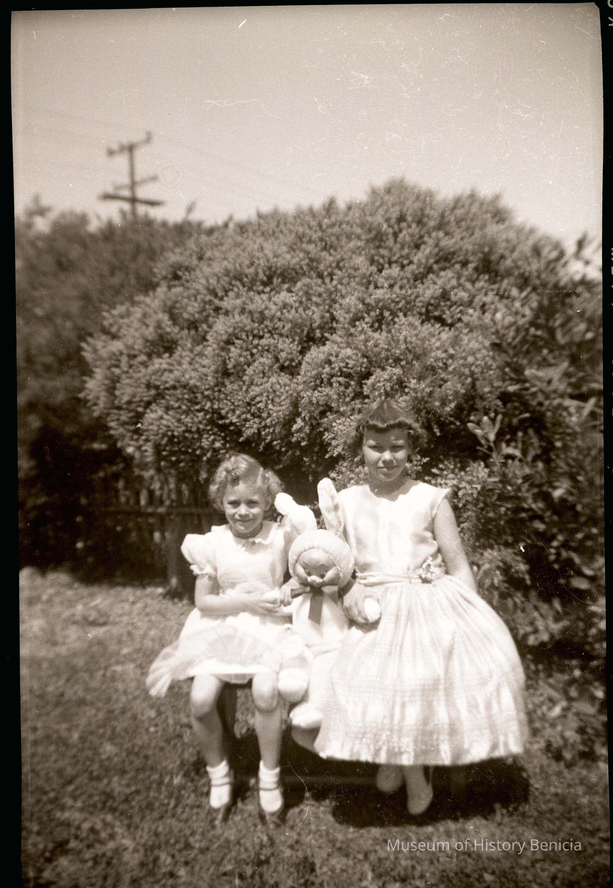 This is two photos on a single strip negative. Both images are of two young girls holding a stuffed rabbit.