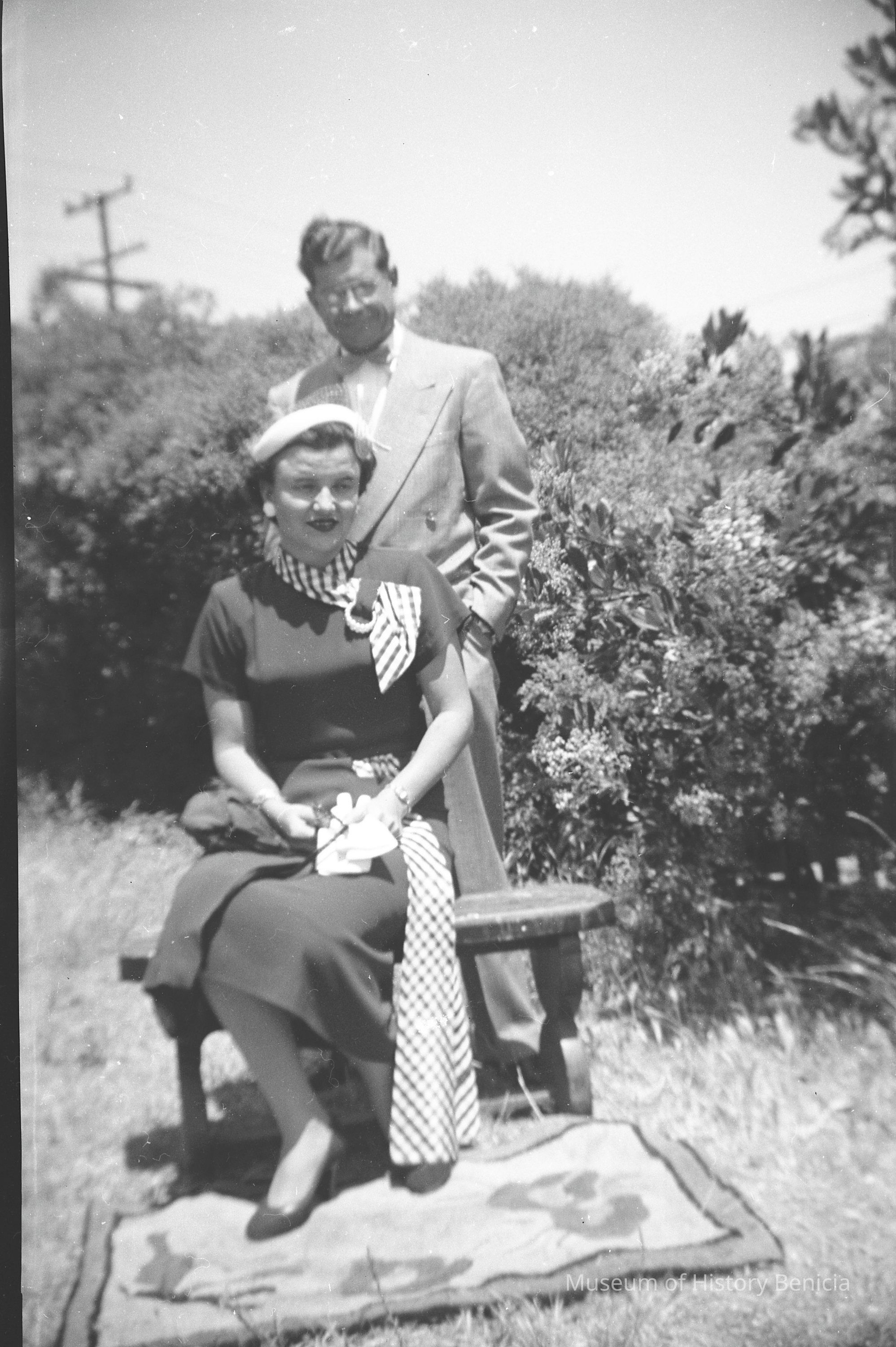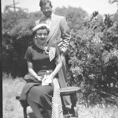 This is two photos on a single strip negative. Both images are of a woman and man on a garden bench.