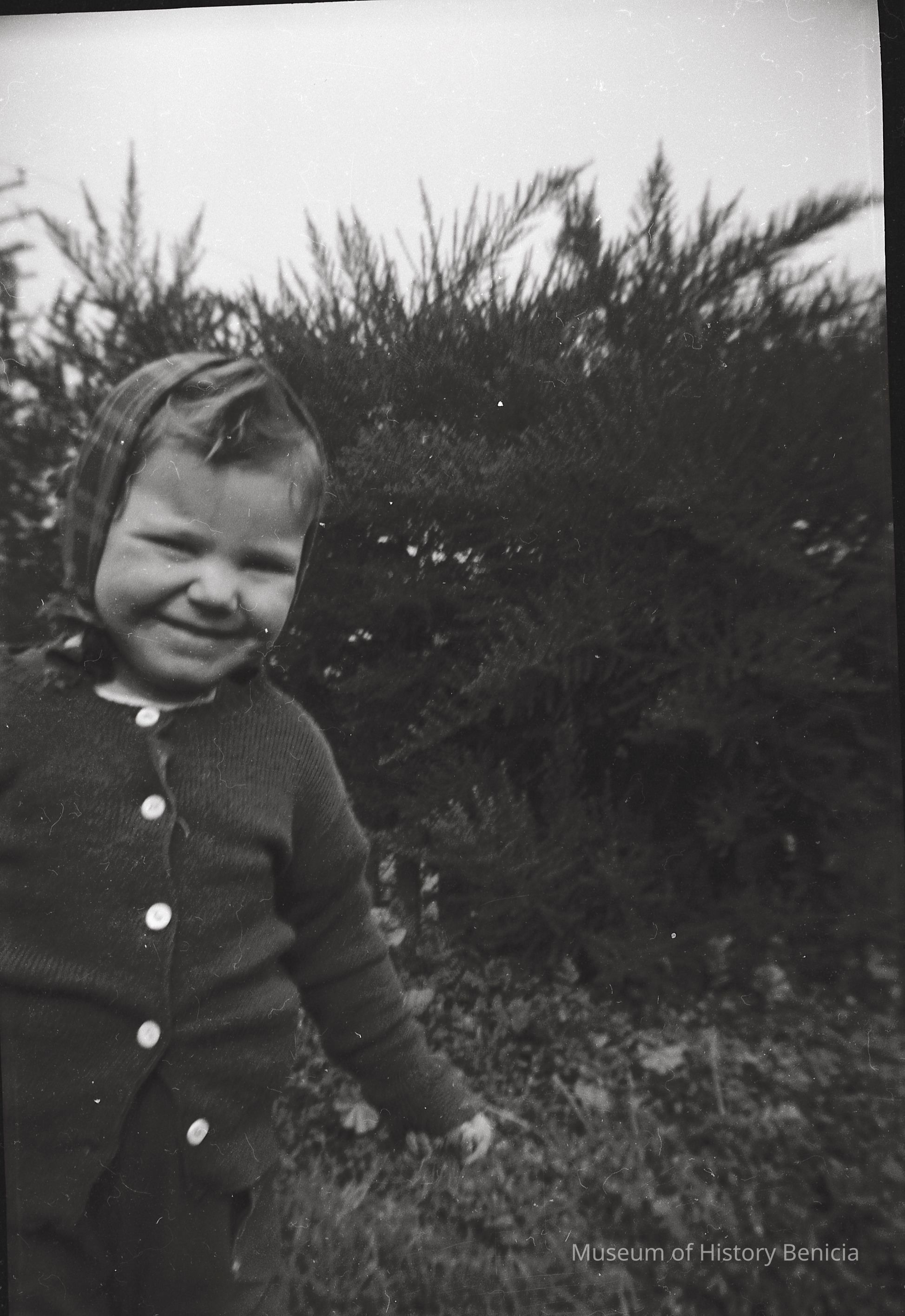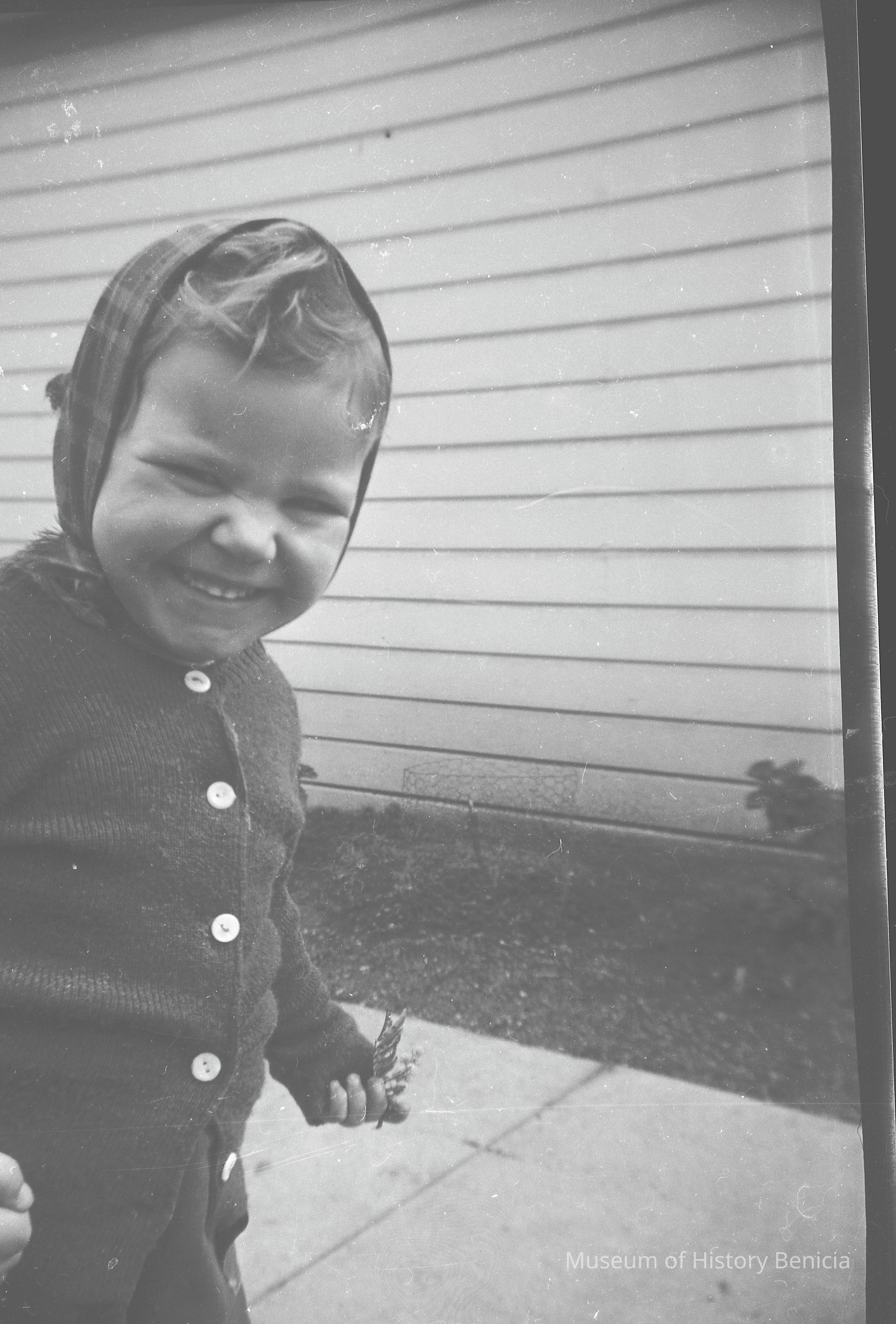 This is two photos on a single strip negative. Both images are of a young girl with a scarf on her head. In one image she is holding flowers.Collection