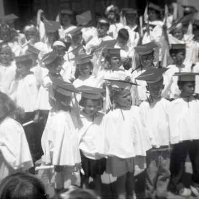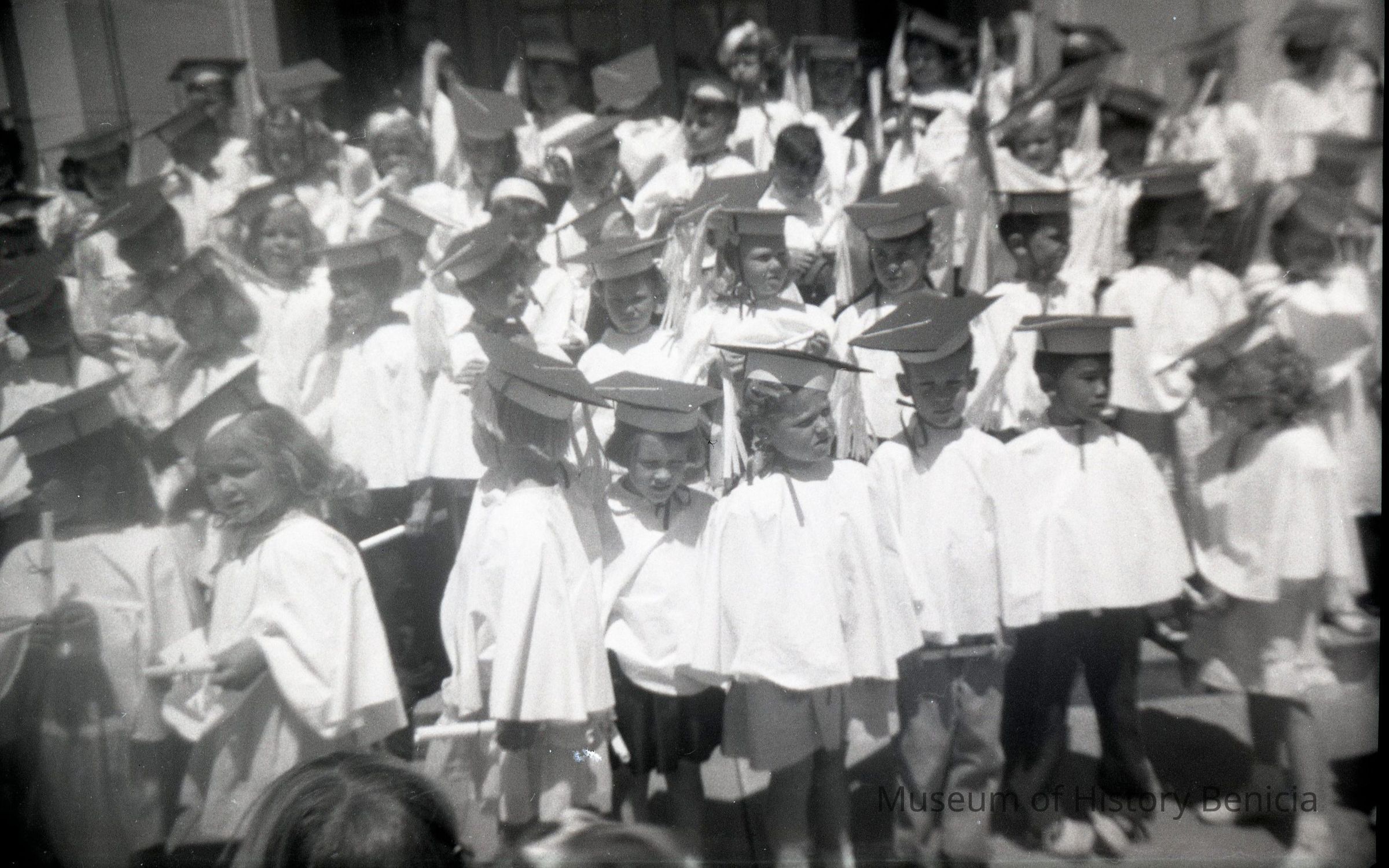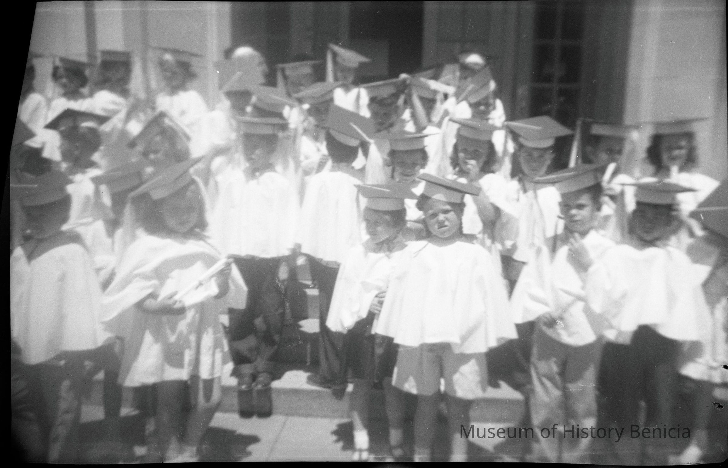 This is two photos on a single strip negative. Both images are of a group of young kids in caps and gowns.