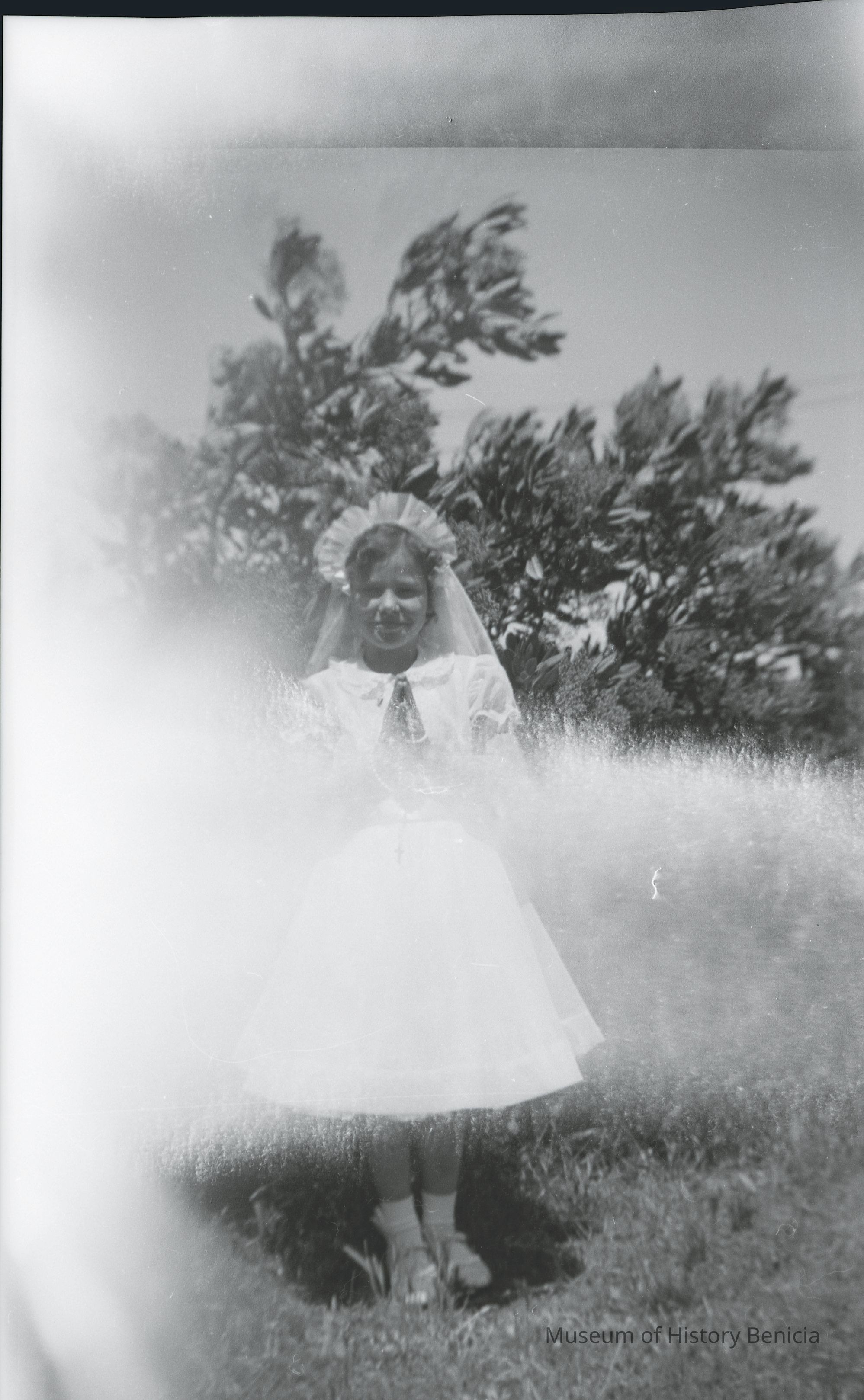 This is two photos on a single strip negative. One image is of a girl in a Sunday dress. The other is so damaged it wasn't scanned.Collection