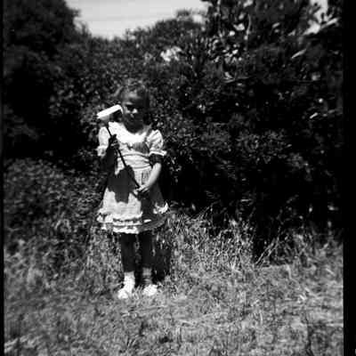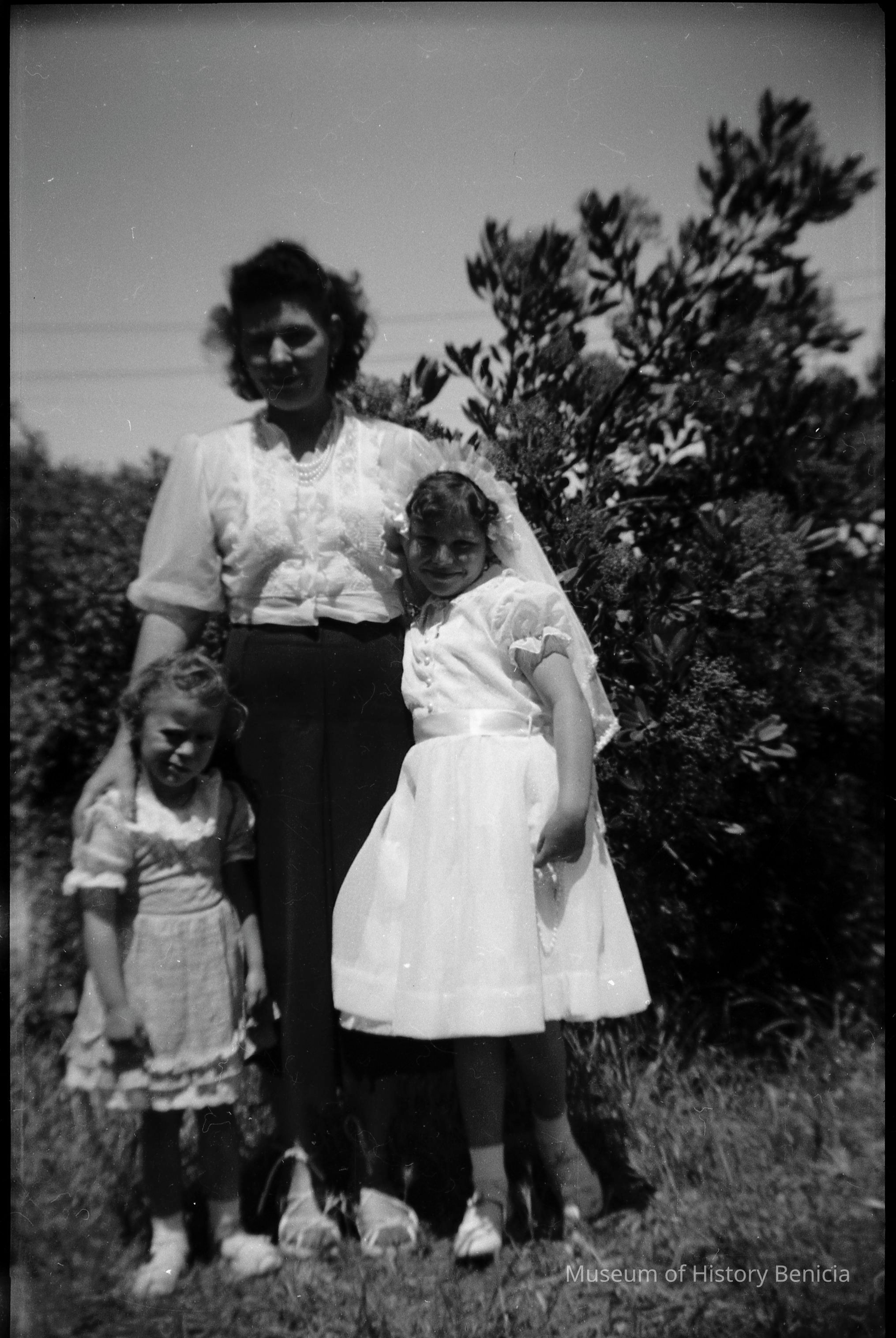 This is two photos on a single strip negative. One image is of a woman and two girls. The other is of a girl holding a flower.