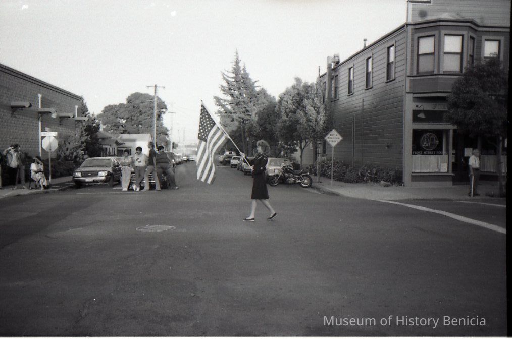 This is a photo of downtown Benicia during a parade. It shows a woman carrying a flag.