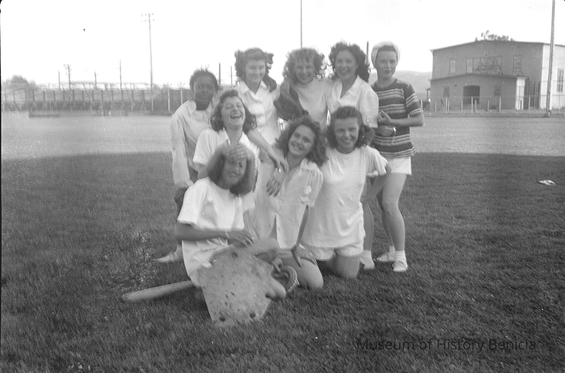 Negative of a young girls in a field next to a school. baseball team.