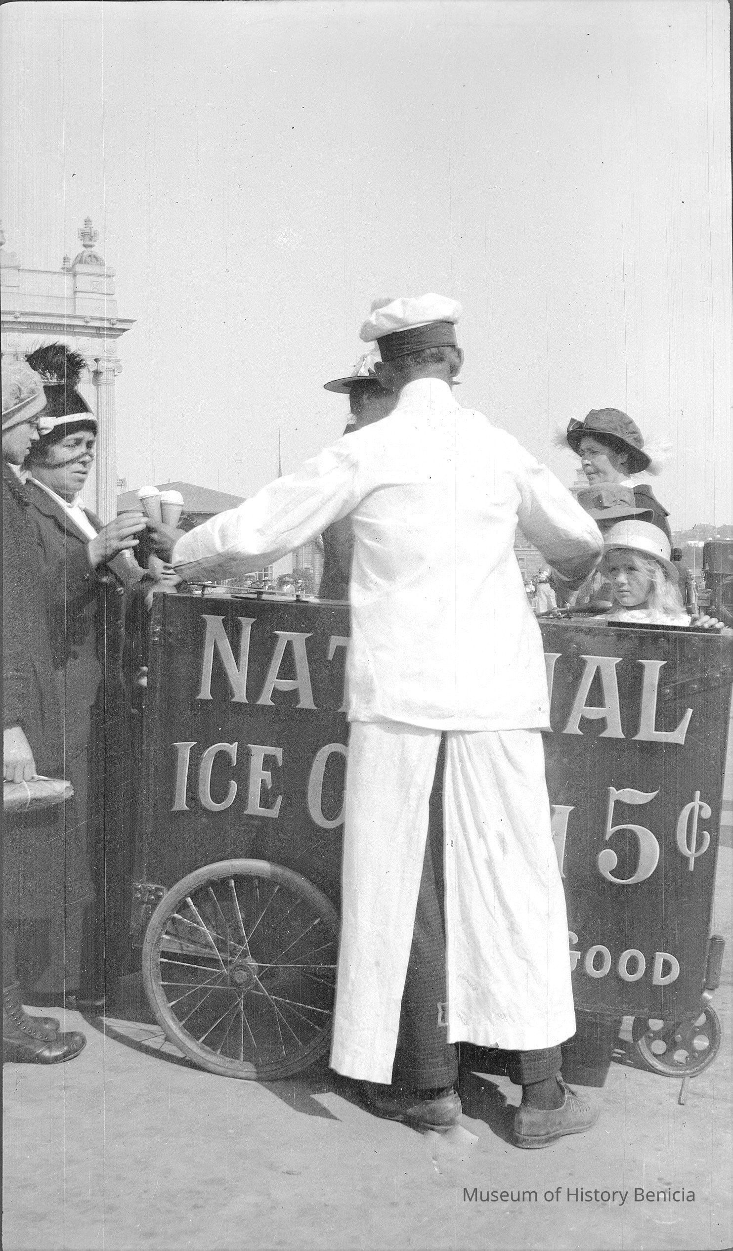Negative of man selling ice cream at the Panama Pacific International Exhibition of 1915 in San Francisco. Dita and Marguerite are buying with Violet barely visable behind the cart.Collection