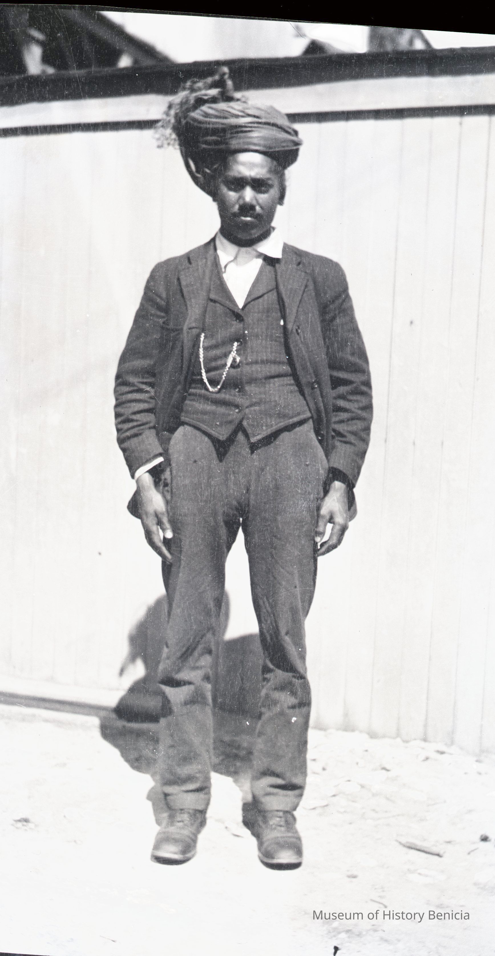 This is negative of a man with a turban standing in front of a fence.