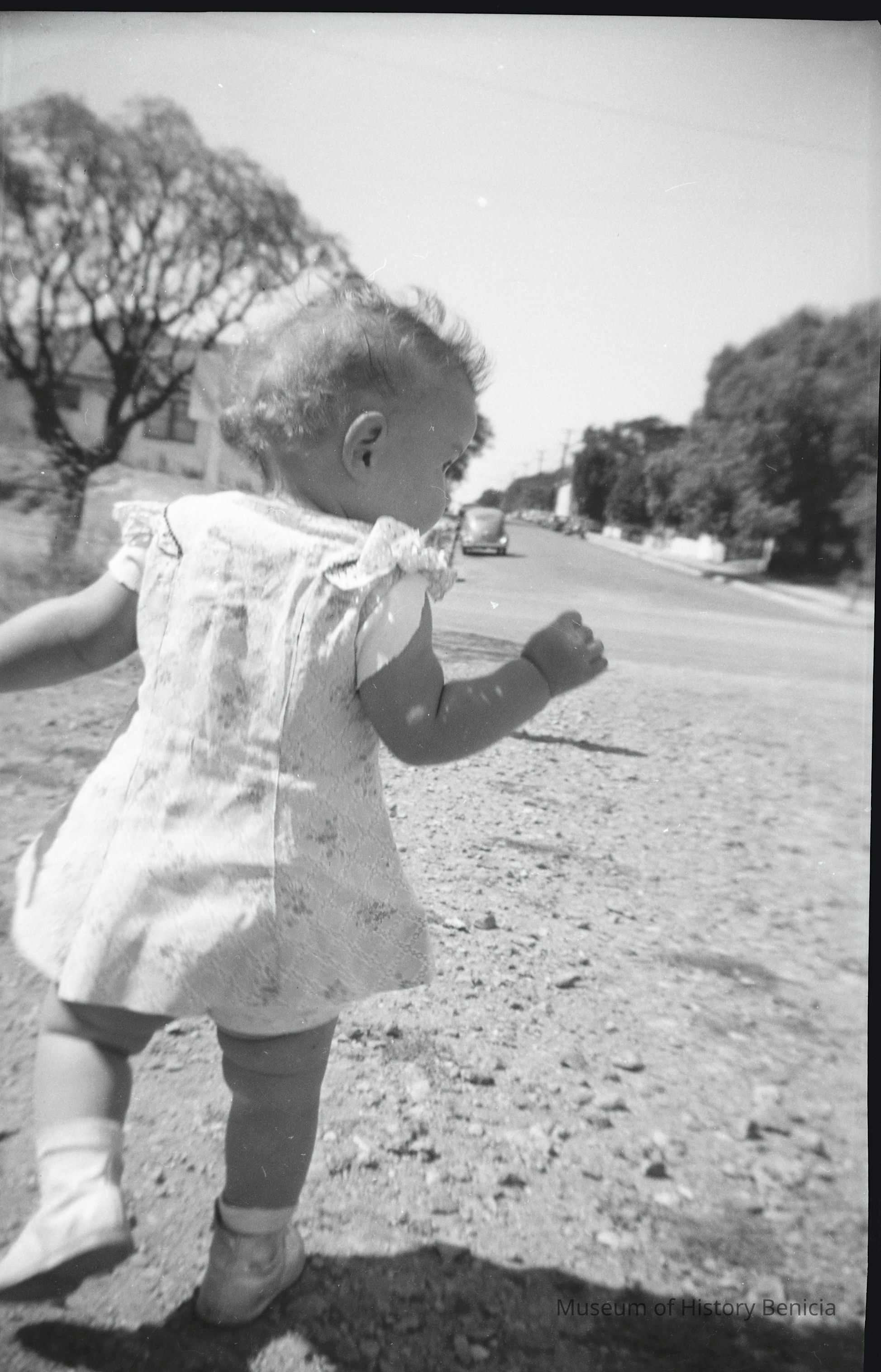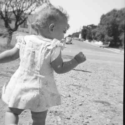 This is two photos on a single strip negative. One negative showsa baby trying to walk. The other shows a man holding the baby.