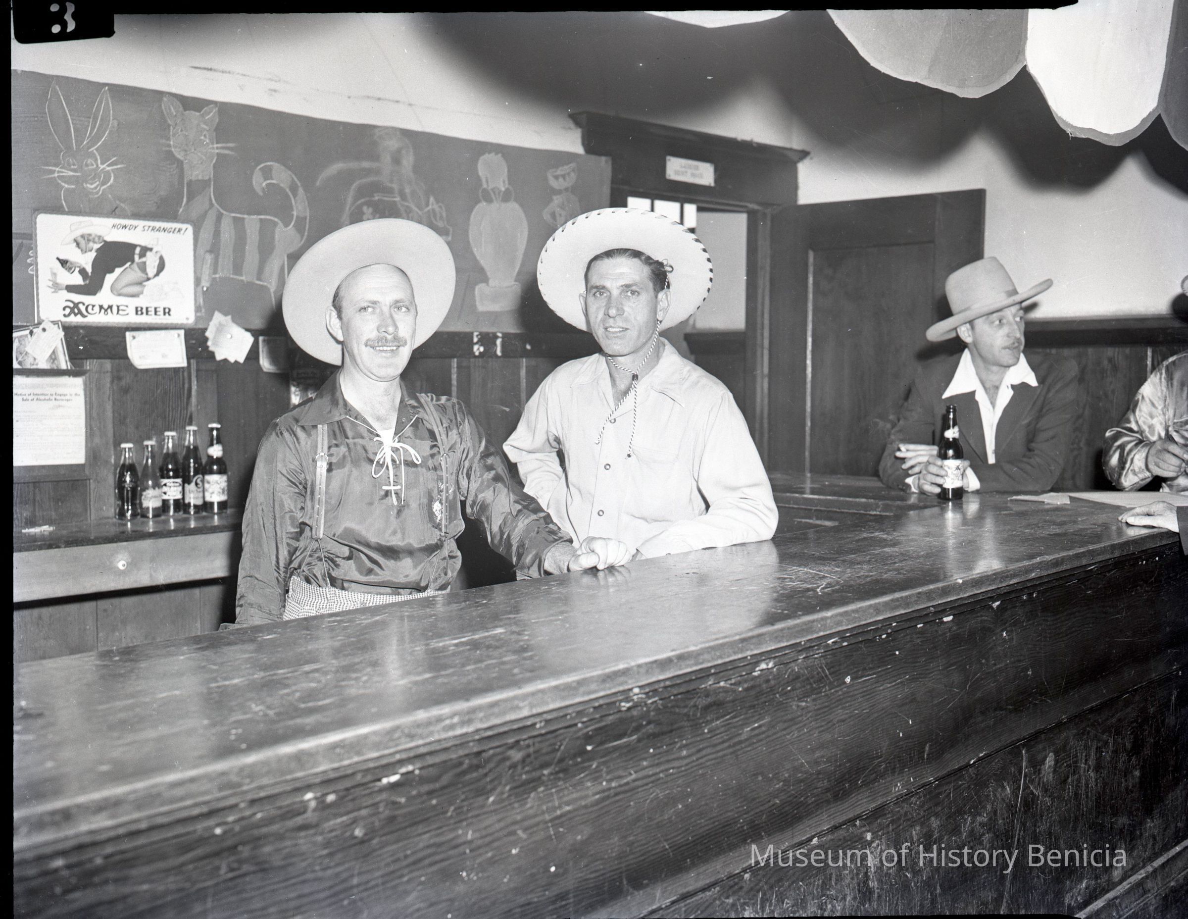 Photo of Old Timers celebrants in a saloon. Probably 1947 or 1945. One of the photos in this group shows a boy standing in front of a sign for the 1945 Old Timers Celebration.